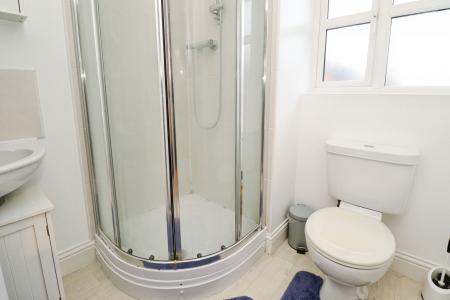EN SUITE SHOWER ROOM Fitted with a three piece suite comprising of shower cubicle, close coupled WC and pedestal wash hand basin, tiled splashbacks, radiator and double glazed window to the front aspect.