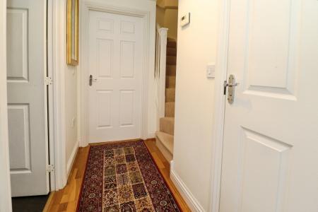 ENTRANCE HALL With staircase to the first floor, laminated parquet flooring and radiator.