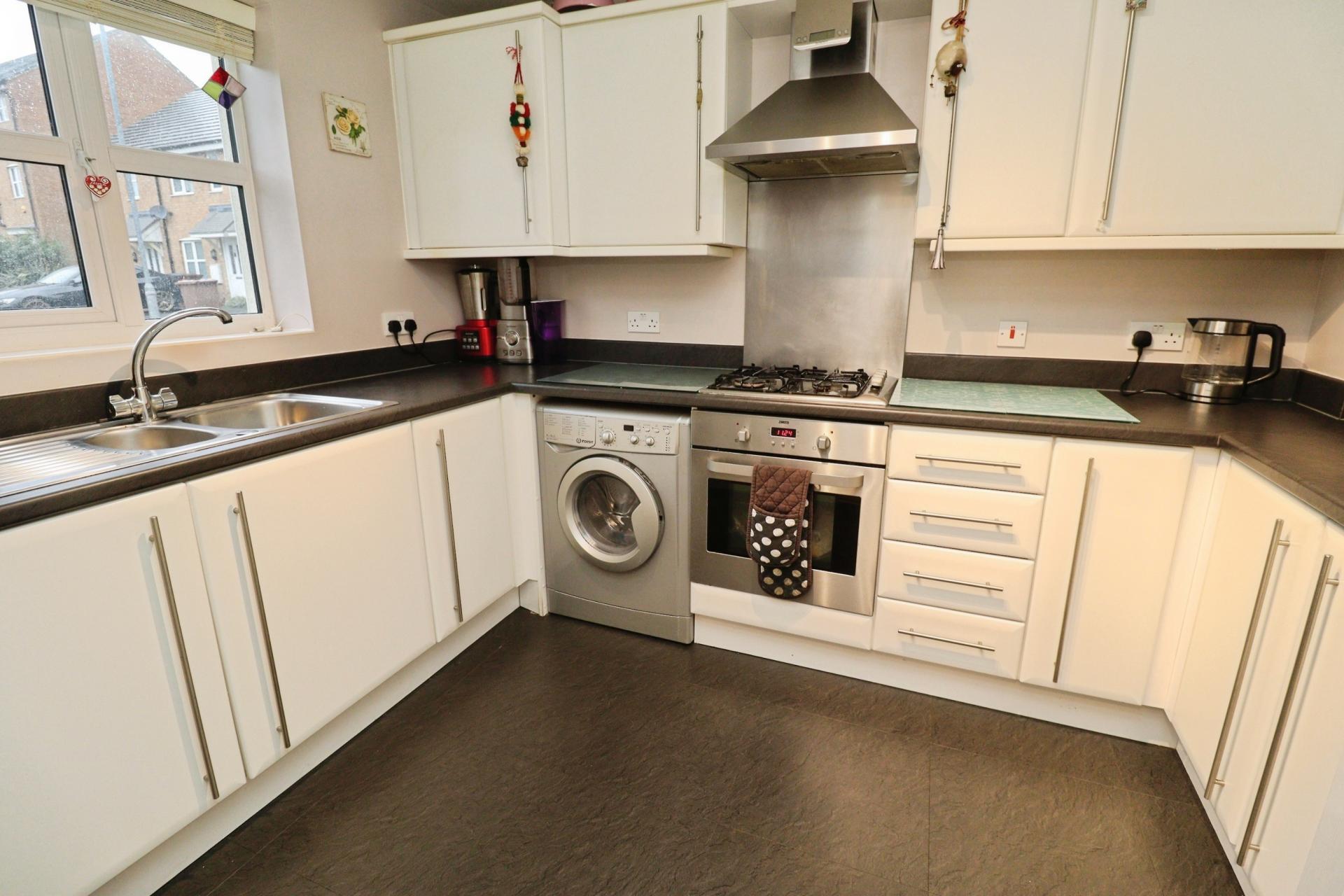 KITCHEN 10' 6" x 7' 8" (3.21m x 2.35m) Fitted with a range of wall and base units with work surfaces over, stainless steel 1½ bowl sink with side drainer and mixer over, electric oven and gas hob with extractor fan over, spaces for washing machine and fridge freezer, radiator and double glazed window to the front aspect.