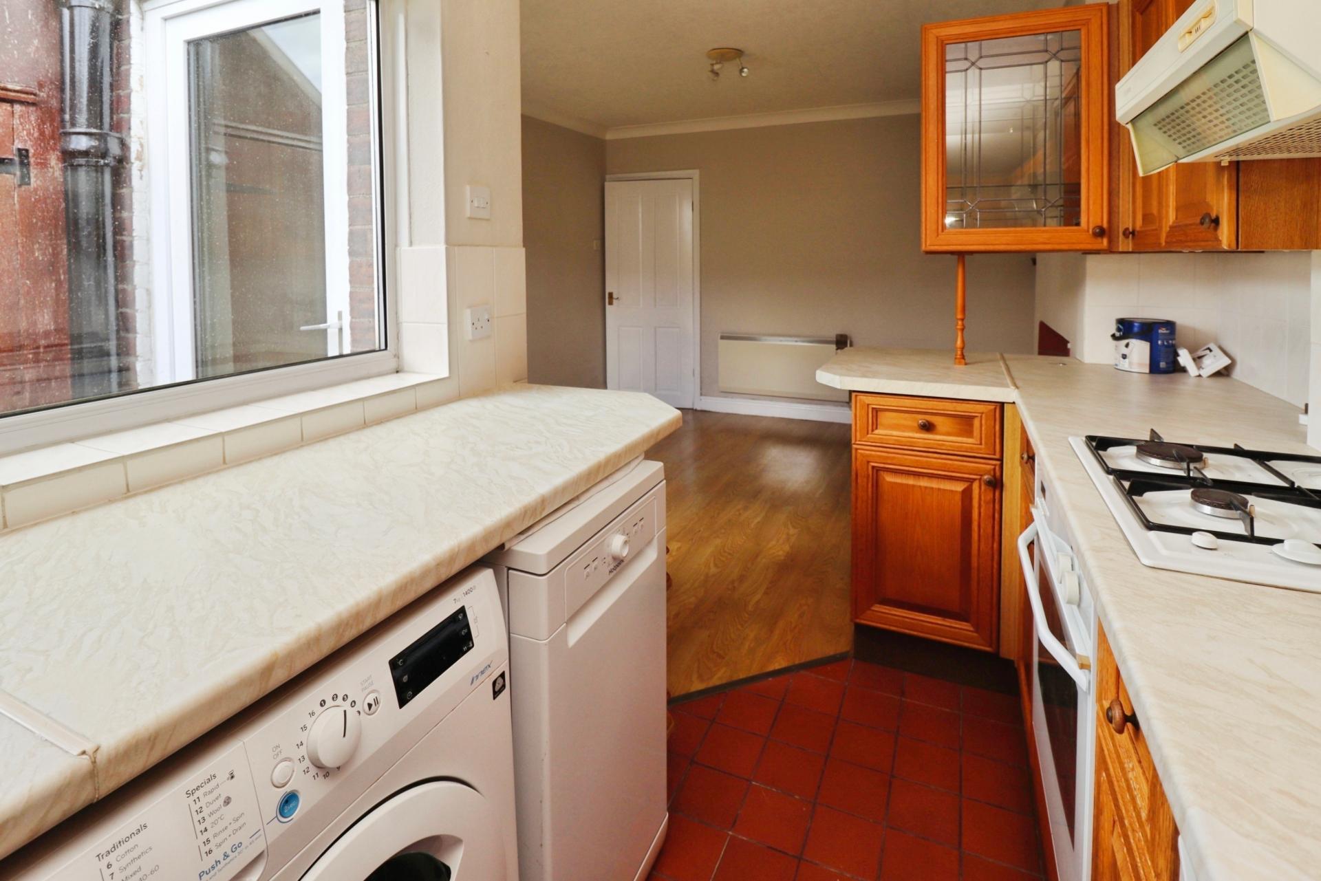 KITCHEN 8' 4" x 6' 4" (2.55m x 1.94m) Fitted with a range of wall and base units with work surfaces over, stainless steel sink with side drainer and mixer tap over, spaces for cooker, washing machine, fridge and slimline dishwasher, tiled flooring and splashbacks and double glazed window to the side aspect.