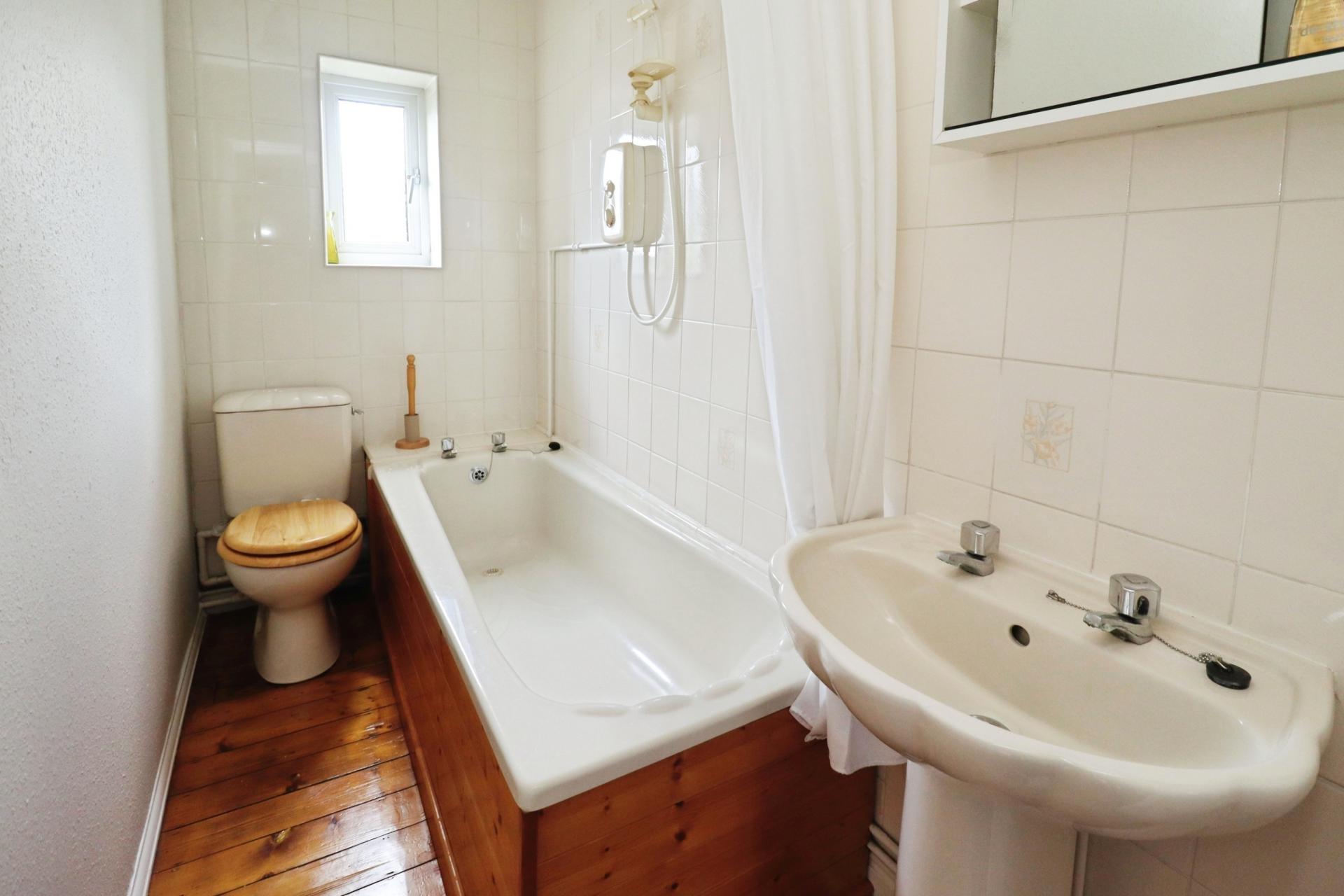 BATHROOM Fitted with a three piece suite comprising of panelled bath with electric shower over, close coupled WC and pedestal wash hand basin, tiled splashbacks, wooden flooring and double glazed window to the rear aspect.