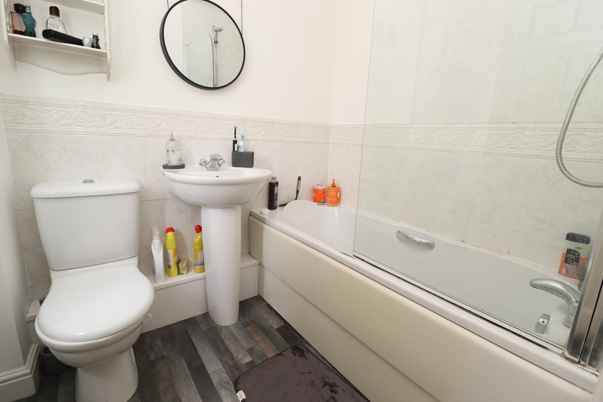 BATHROOM Fitted with a three-piece suite comprising of panelled bath with shower over and glass shower screen, pedestal wash hand basin and close coupled WC, tiled splashbacks, spotlights, electric radiator and double glazed window.