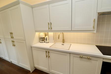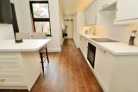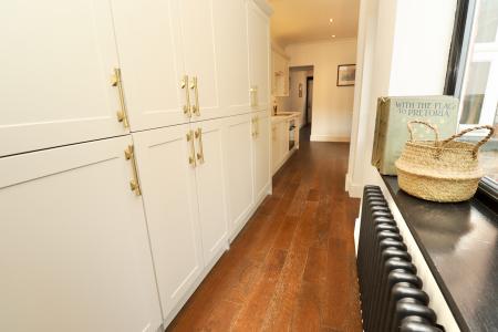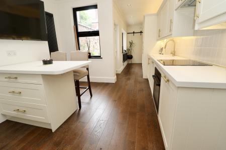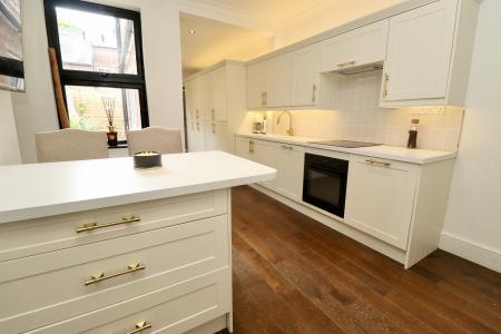 KITCHEN/DINER 25' 11 (max)" x 11' 7" (7.9m x 3.55m) An impressive newly fitted kitchen with a stylish range of wall and base units with work surfaces over, sink unit with mixer tap over, electric oven and hob with extractor fan, integrated fridge freezer and dishwasher, spaces for washing machine and tumble dryer, Island with breakfast bar, tiled splashbacks, wood flooring, two radiators, spotlights, under cabinet lighting, under stairs storage cupboard, double glazed window to the side and rear aspects and door to the garden.