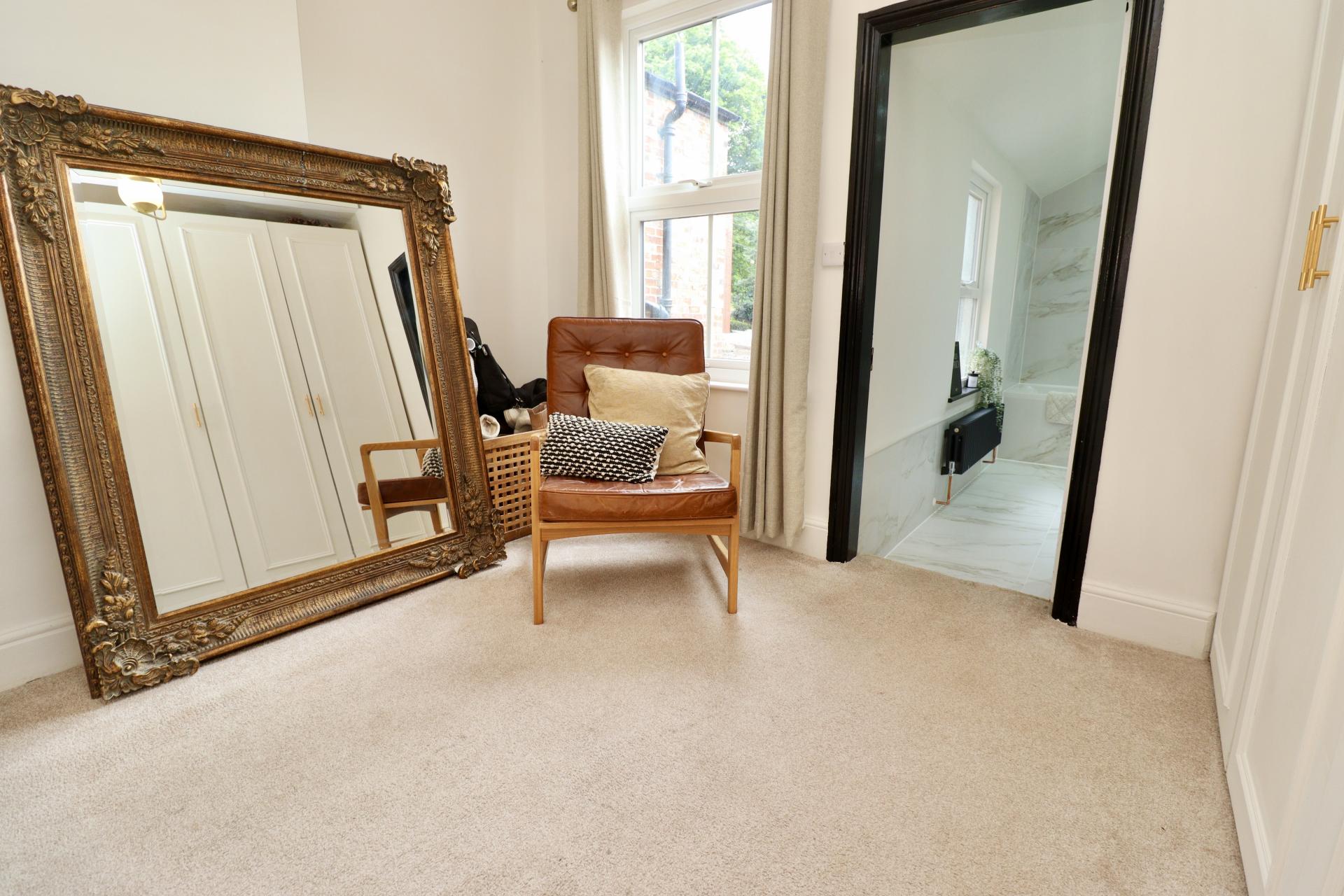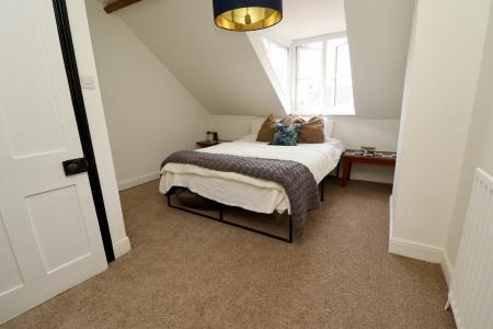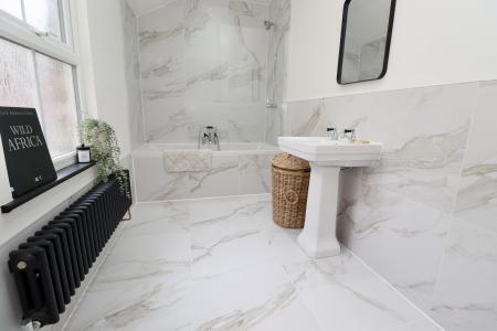 EN-SUITE BATHROOM  Newly fitted with a stylish three piece suite comprising of panelled bath with shower over and glass shower screen, close coupled WC and pedestal wash hand basin, tiled flooring and part tiled walls, radiator, spotlights and double glazed window to the side aspect.