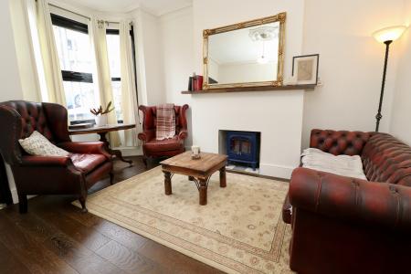 LOUNGE 11' 11" x 11' 7" (3.65m x 3.55m) With double glazed bay window to the front aspect, electric log burner, wood flooring and radiator.