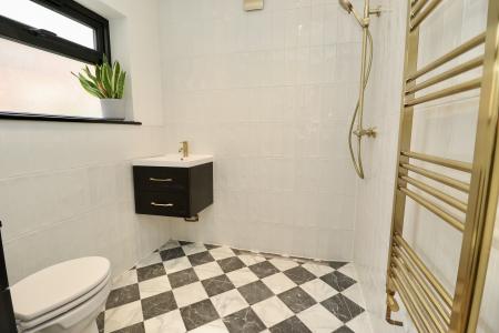 SHOWER ROOM  Newly fitted with a stylish three piece suite comprising of wet room shower, close coupled WC and wash hand basin in a vanity style unit, tiled flooring and part tiled walls, gold coloured towel radiator, spotlights and double glazed window to the side aspect.