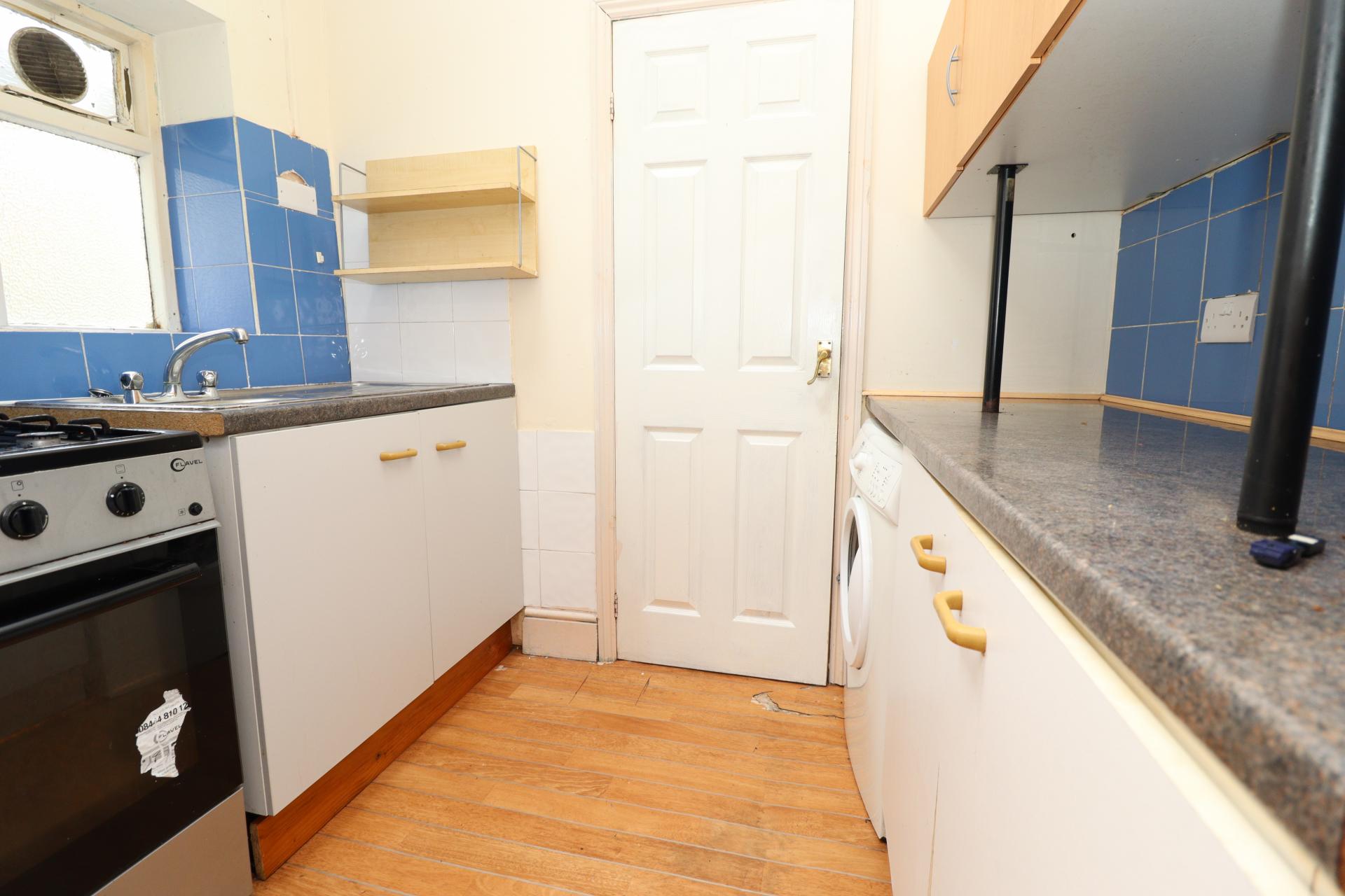 KITCHEN 7' 8" x 5' 5" (2.35m x 1.66m) Fitted with wall and base units with work surfaces over, stainless steel sink and side drainer with mixer tap over, spaces for cooker and washing machine, tiled splashbacks, laminate flooring and Velux window and window to the side aspect.