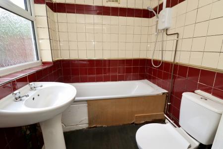BATHROOM Fitted with a three piece suite comprising of panelled bath with shower over, close coupled WC, pedestal wash hand basin, tiled walls, radiator and double glazed window to the side aspect.