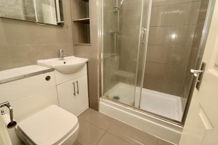 SHOWER ROOM Fitted with a three piece suite comprising of shower cubicle, close coupled WC, wash hand basin in a vanity style unit, chrome towel radiator, tiled flooring and splashbacks.
