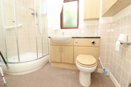 SHOWER ROOM Fitted with a four piece suite comprising of shower cubicle, wash hand basin in a vanity unit with storage beneath, close coupled WC and bidet, part-tiled walls, chrome towel radiator, wall storage cupboards and double glazed window.