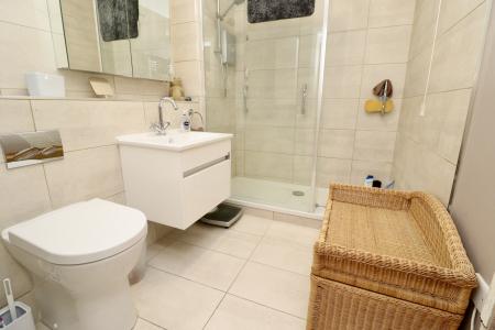 SHOWER ROOM Fitted with a three piece suite comprising of walk-in shower cubicle, close coupled WC and wash hand basin in a vanity style unit, tiled flooring, part tiled walls and towel radiator.