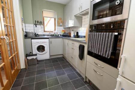 KITCHEN 11' 3" x 6' 5" (3.45m x 1.97m) Fitted with a range of wall and base units with work surfaces over, stainless steel sink with side drainer and mixer tap, eye level electric oven and microwave, electric hob with extractor fan over, spaces for fridge freezer and washing machine, tiled splashbacks and double glazed window to the side aspect.