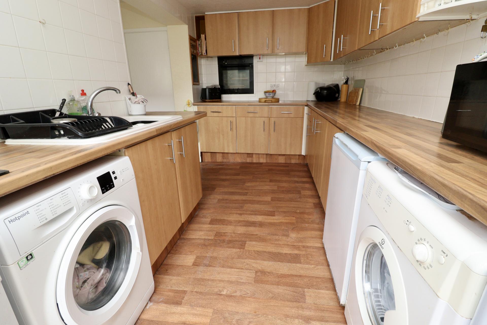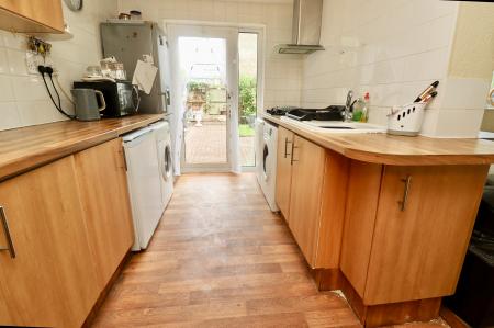 KITCHEN 14' 0" x 7' 6" (4.29m x 2.30m) Fitted with a range of wall and base units with work surfaces over, ceramic sink with side drainer and mixer tap over, eye level electric oven, gas hob, spaces for fridge freezer, washing machine, tumble dryer and dishwasher, tiled splashbacks and door to the rear garden.