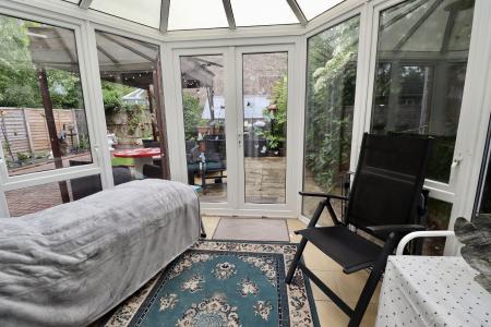 CONSERVATORY 9' 9" x 8' 2" (2.99m x 2.51m) With double glazed French doors to the rear garden and tiled flooring.
