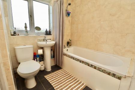 BATHROOM Fitted with a three piece suite comprising of panelled bath with electric shower over, close coupled WC and pedestal wash hand basin, tiled flooring, part tiled walls, chrome towel radiator, airing cupboard and double glazed window to the rear aspect.