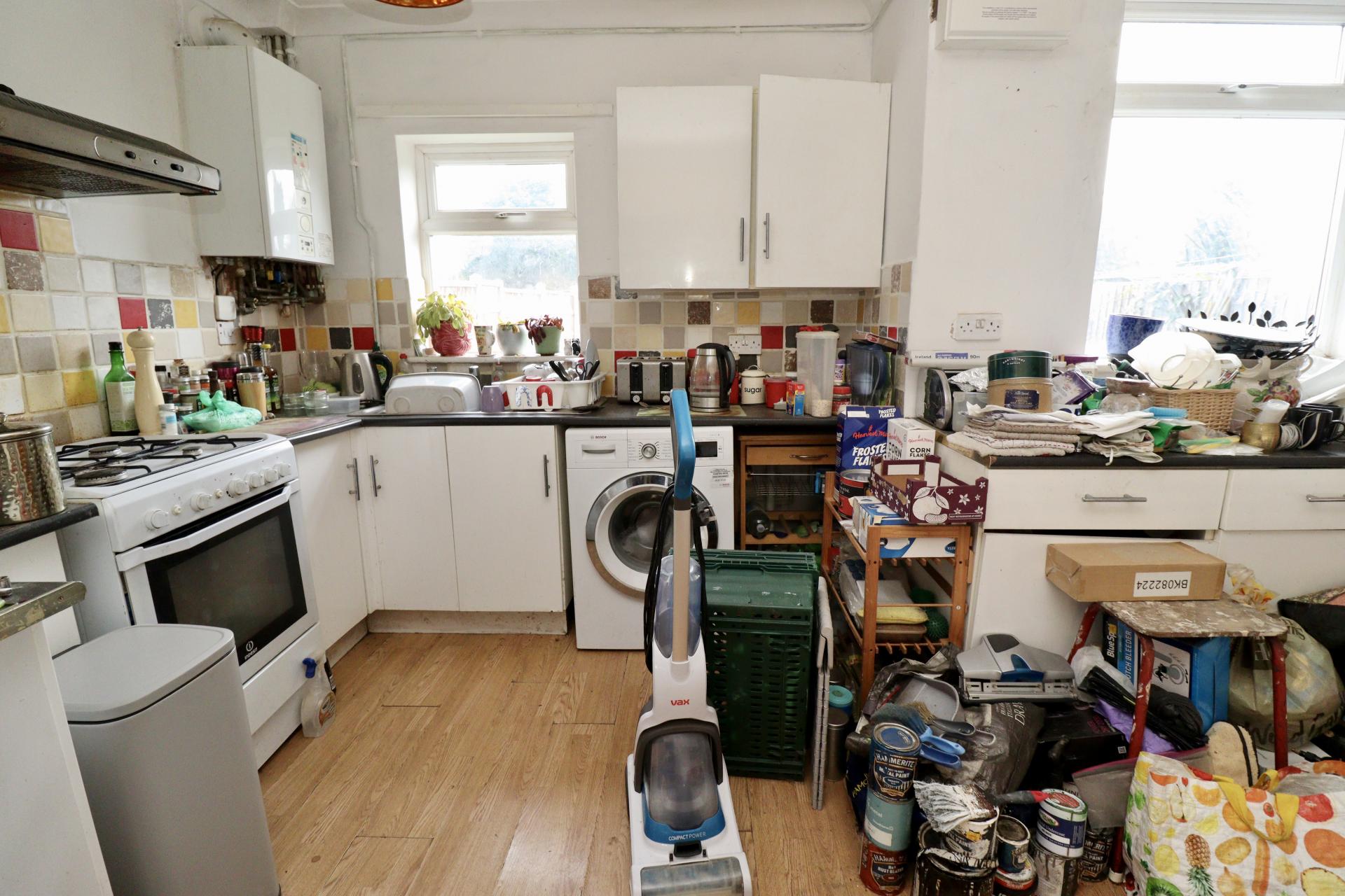 KITCHEN 14' 9" x 11' 0" (4.5m x 3.35m) Fitted with a range of wall, drawer and base units with work surfaces over, space for a freestanding cooker, plumbing and space for a washing machine, stainless steel sink and drainer, two UPVC double-glazed windows and radiator.