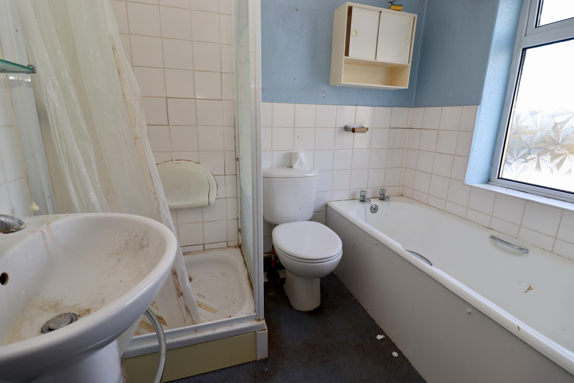BATHROOM Fitted with a four piece suite comprising of panelled bath, shower cubicle, pedestal wash hand basin and close coupled WC, airing cupboard, tiled splashbacks and double glazed window to the rear aspect.