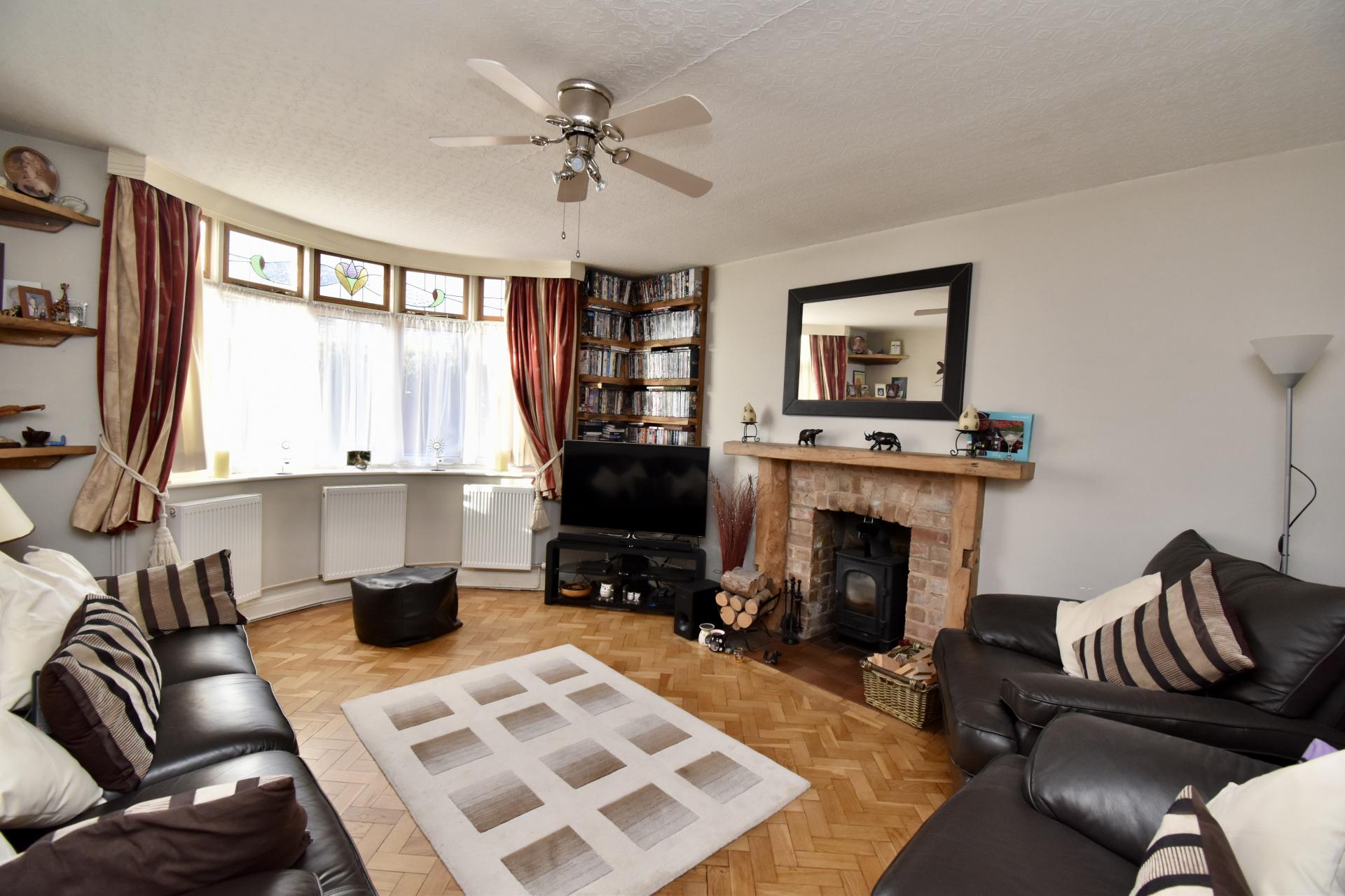 LOUNGE 14' 2" x 12' 9" (4.33m x 3.90m) With uPVC bay window to the front aspect, log burner with tiled hearth and wooden surround, parquet wooden flooring and radiators.
