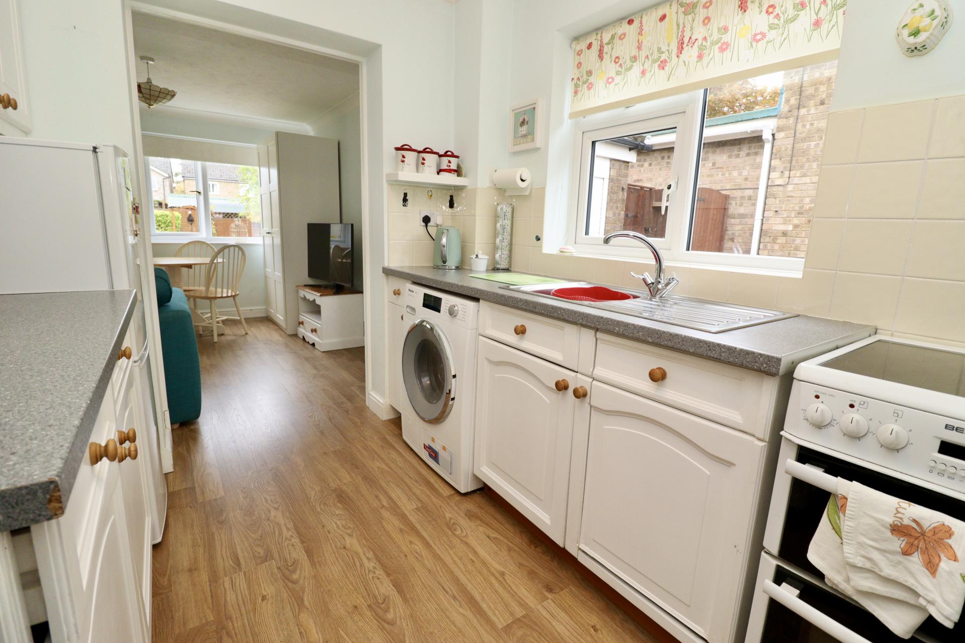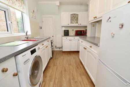 KITCHEN 10' 2" x 7' 8" (3.12m x 2.34m) Fitted with a range of wall and base units with work surfaces over, stainless steel sink with side drainer and mixer tap over, integrated dishwasher, spaces for fridge freezer, cooker and washing machine, pantry cupboard, tiled splashbacks, laminate flooring, radiator and double glazed window to the side aspect.