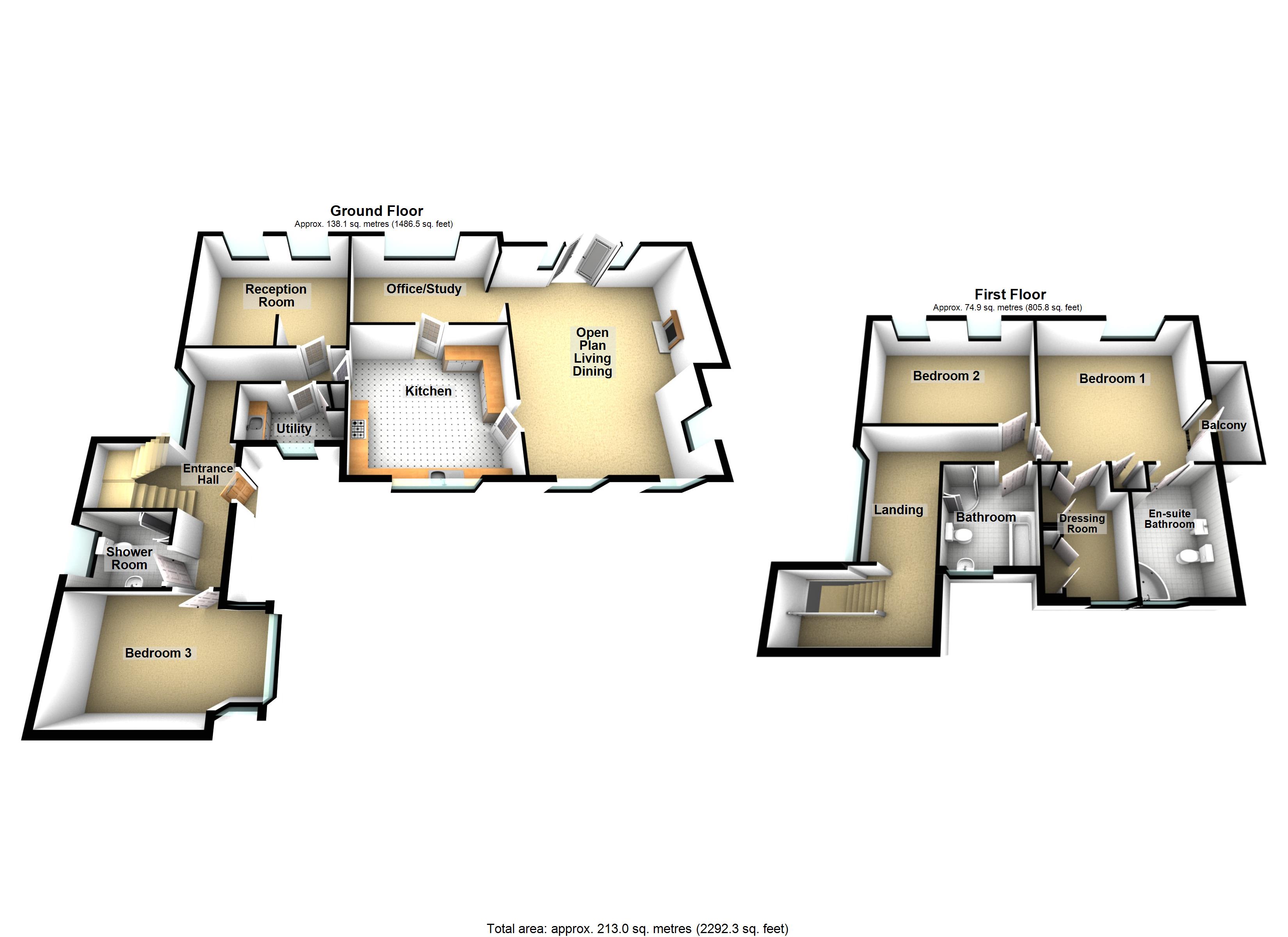 The ground floor also includes two generous double bedrooms , one of which could easily serve as an additional reception room and a well-appointed shower room.