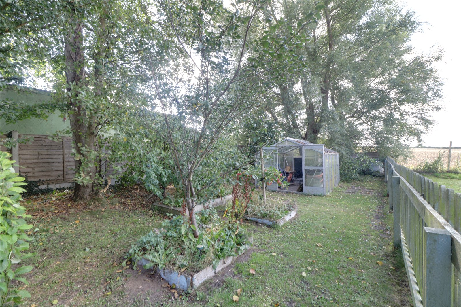To the side, a high gate opens to a private garden area with additional gravelled space, a lawn with raised vegetable beds, and a greenhouse. The rear garden is mainly laid to lawn and is best enjoyed from the two-tiered flagged terrace, which offers open views across the surrounding farmland.