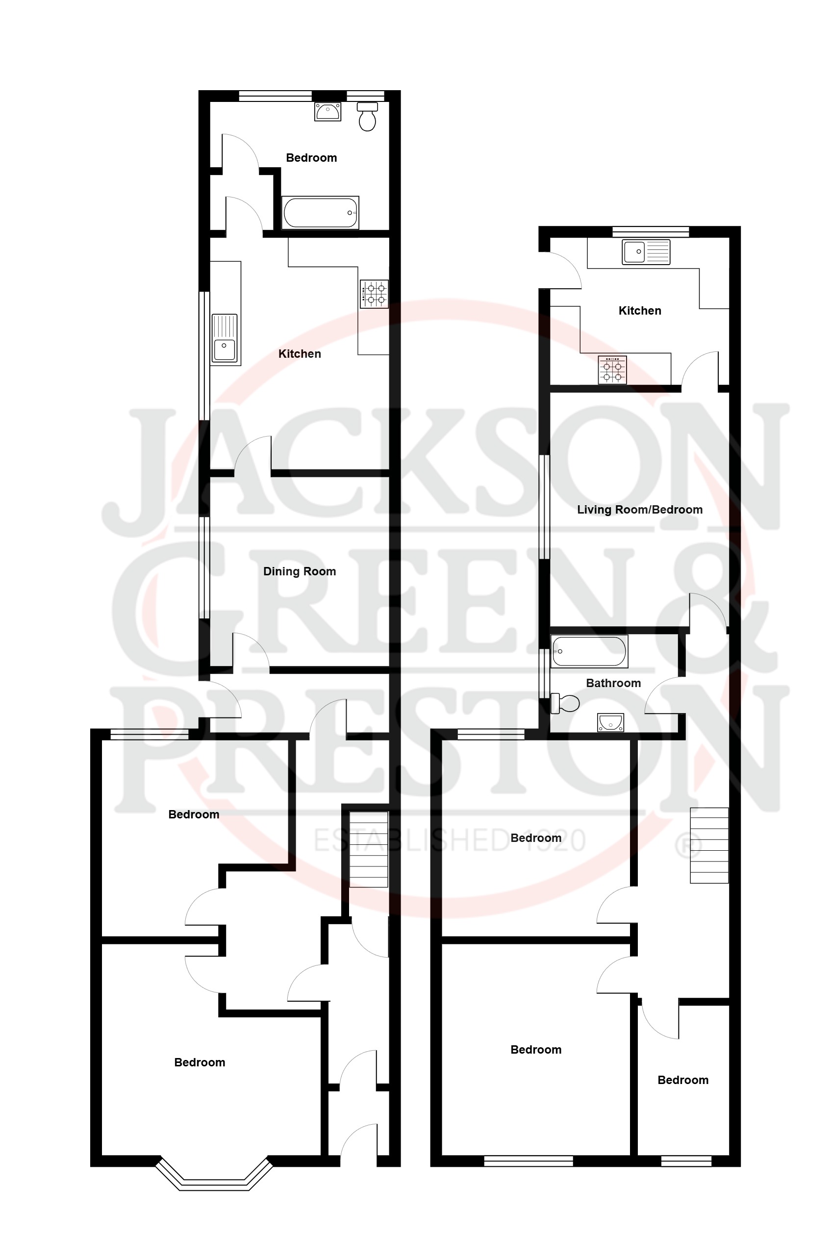 - First floor flat: living room, kitchen, three bedrooms and bathroom