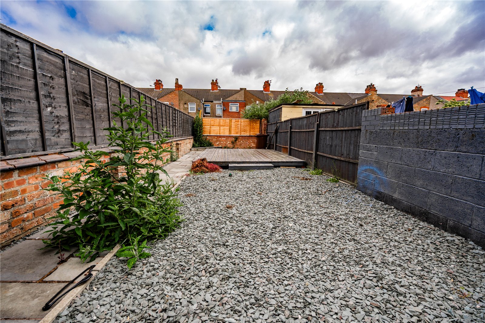 - Low-maintenance shaled rear garden with decking