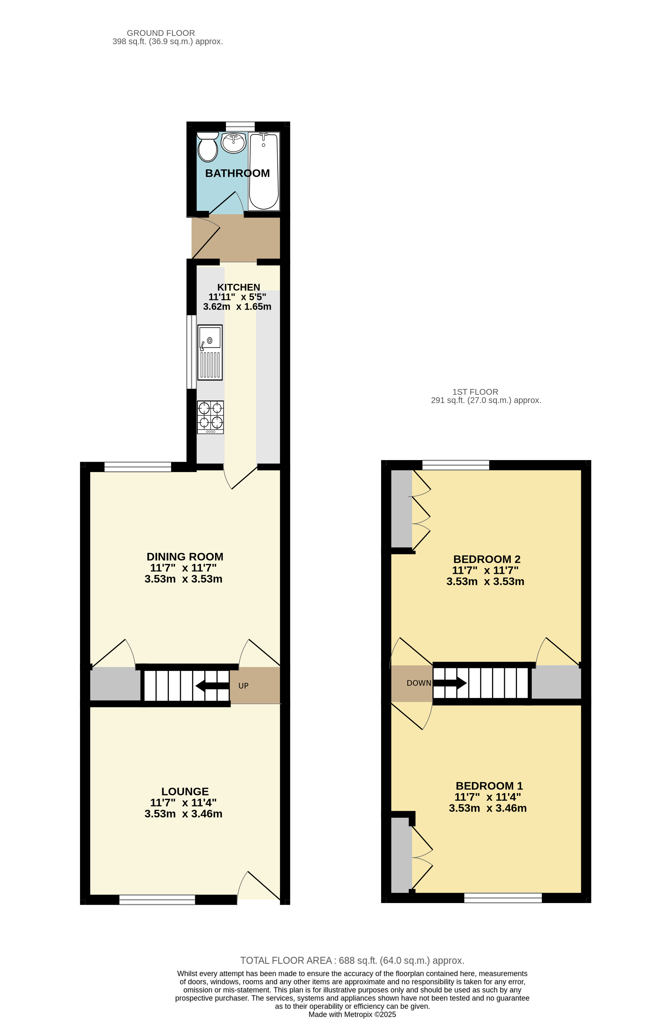 The ground floor accommodates 2 separate reception rooms, kitchen and a bathroom, whilst the first floor accommodates the 2 double bedrooms.