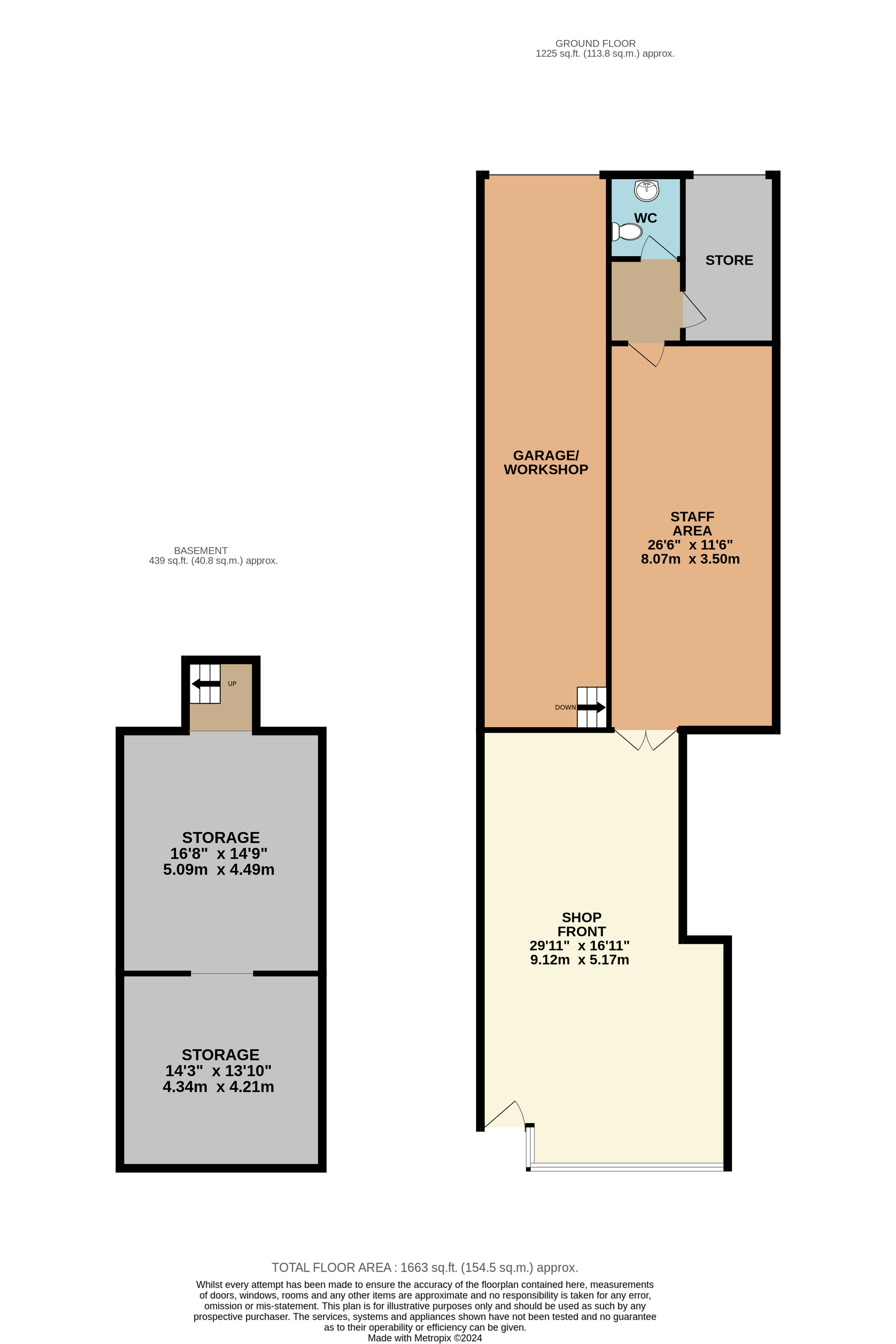 The front retail shop features a main retail area (approx. 47sqm / 505sqft), store/office (approx. 29sqm / 312sqft), kitchenette, and W.C. It is complemented by a rear storage/production area, including basement storage and convenient rear loading access.