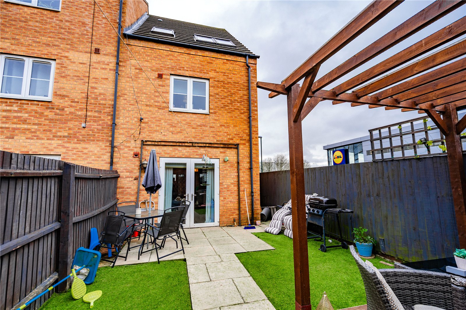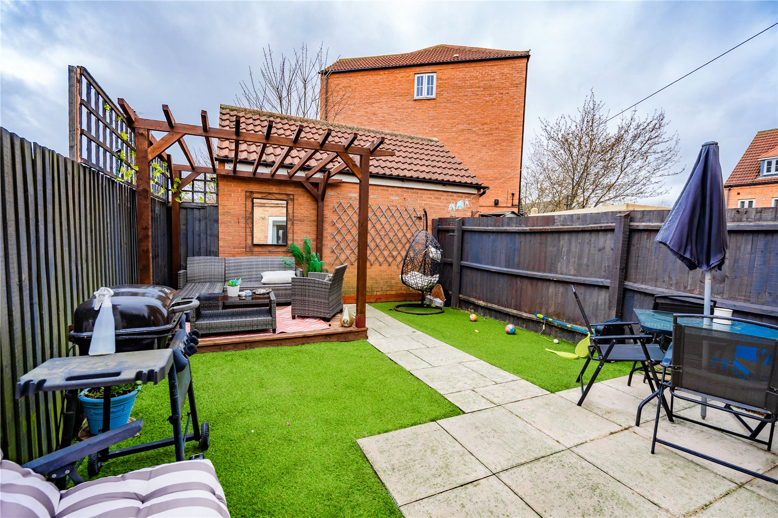- Secure rear garden with artificial lawn, paving and decking