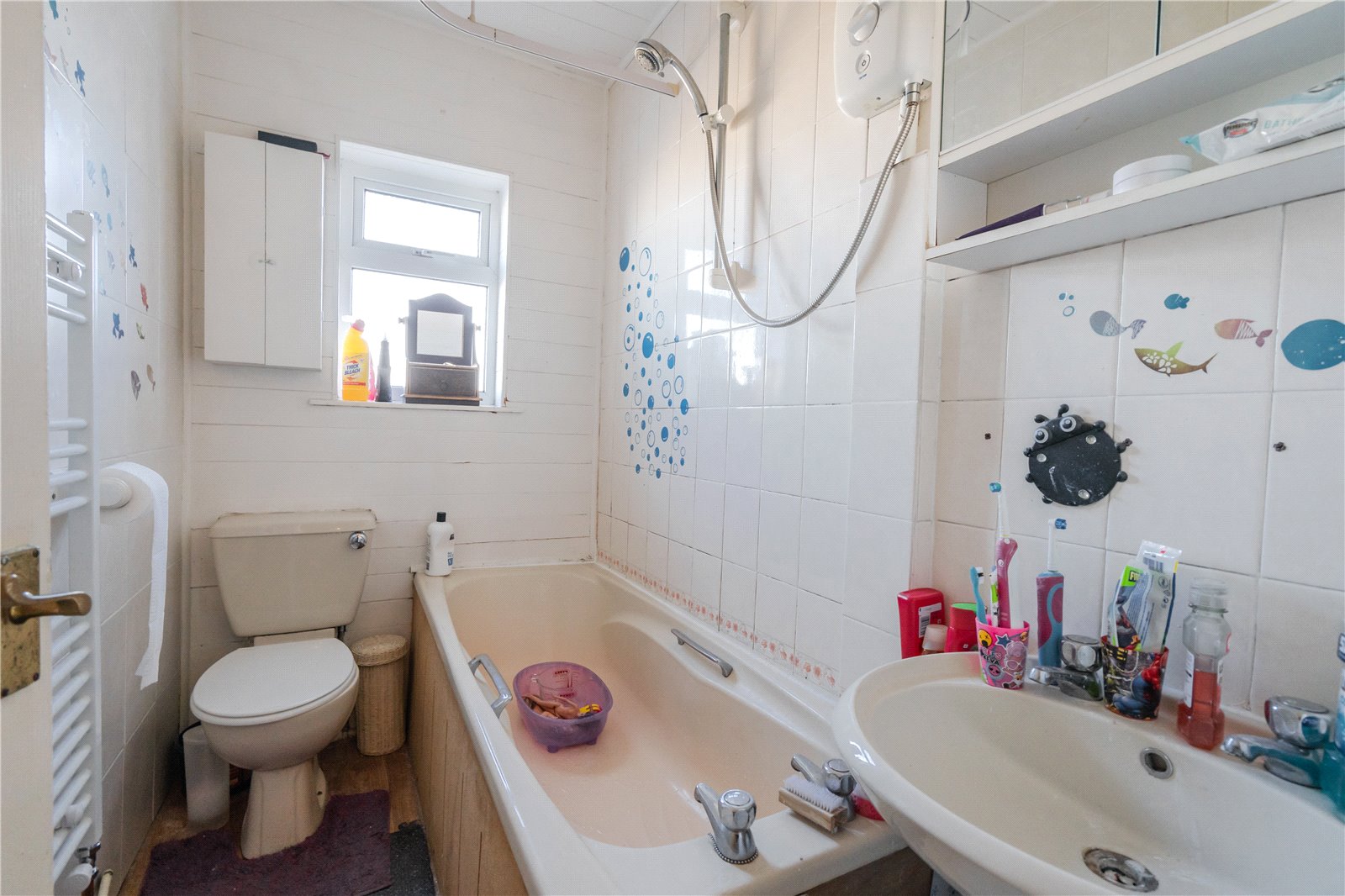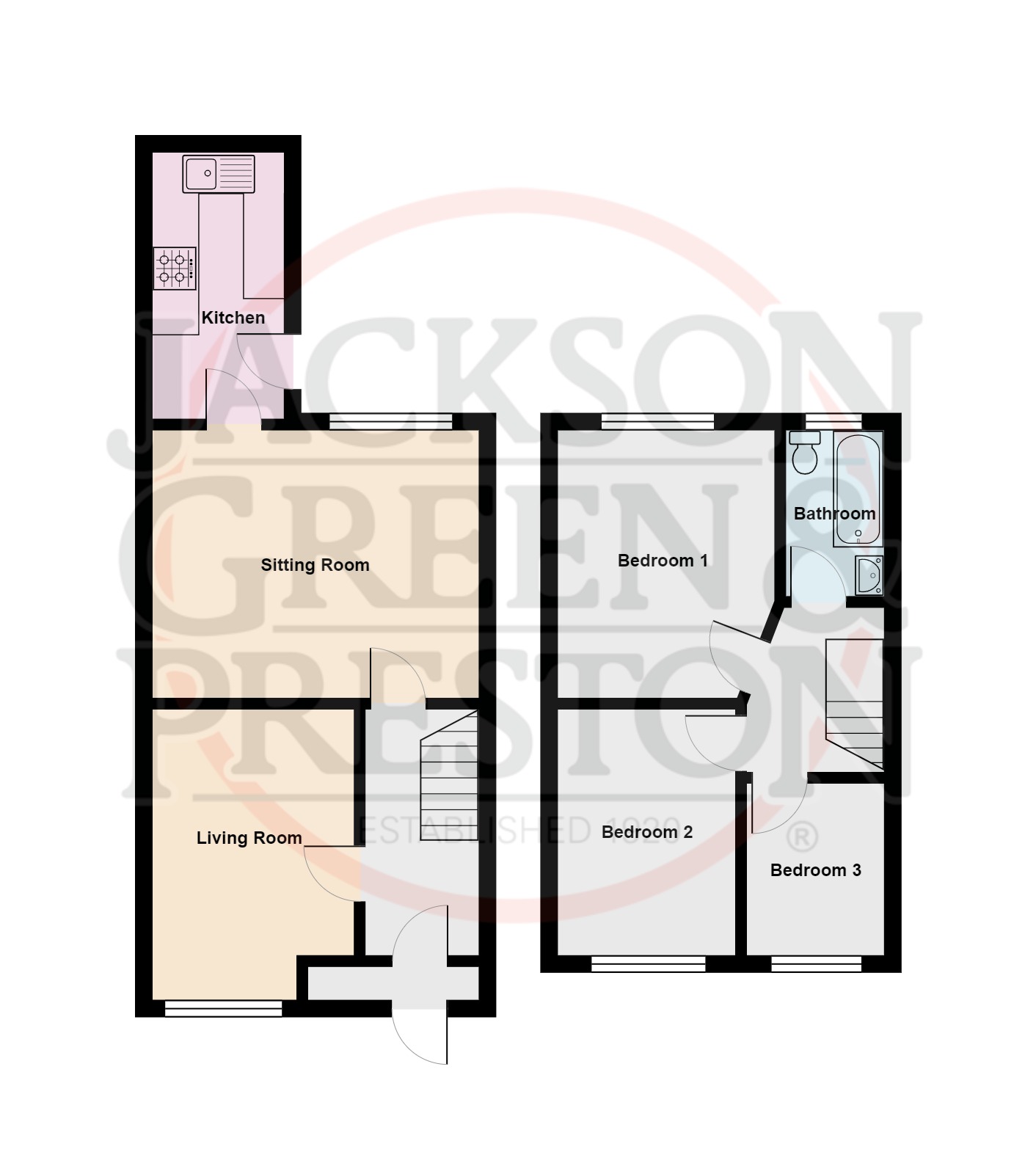 The property has accommodation comprising storm porch, entrance hall, living room, sitting room and kitchen with modern fitted units with integrated appliances (oven, hob, extractor). On the first floor there are three bedrooms and the bathroom with three piece suite.