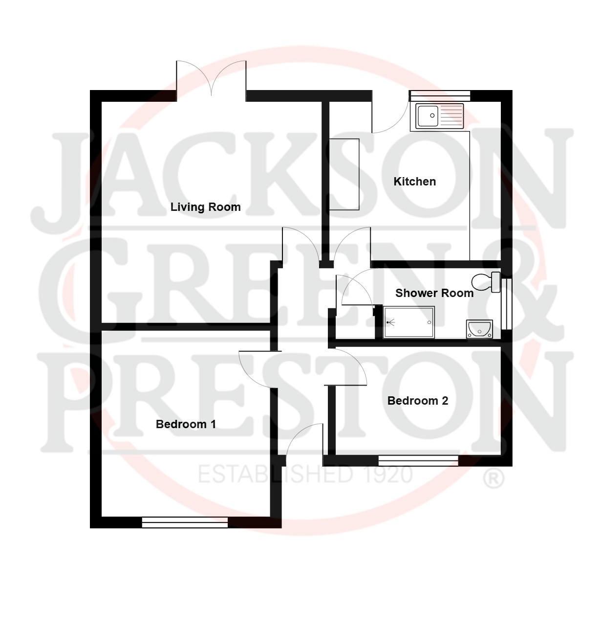 The accommodation comprises an entrance hallway leading to two bedrooms, a living room and a kitchen.
