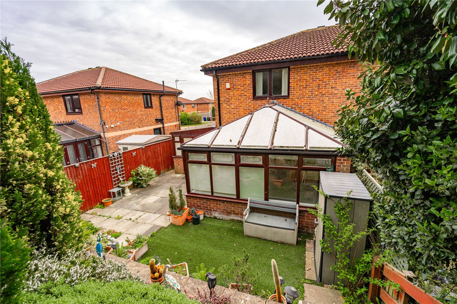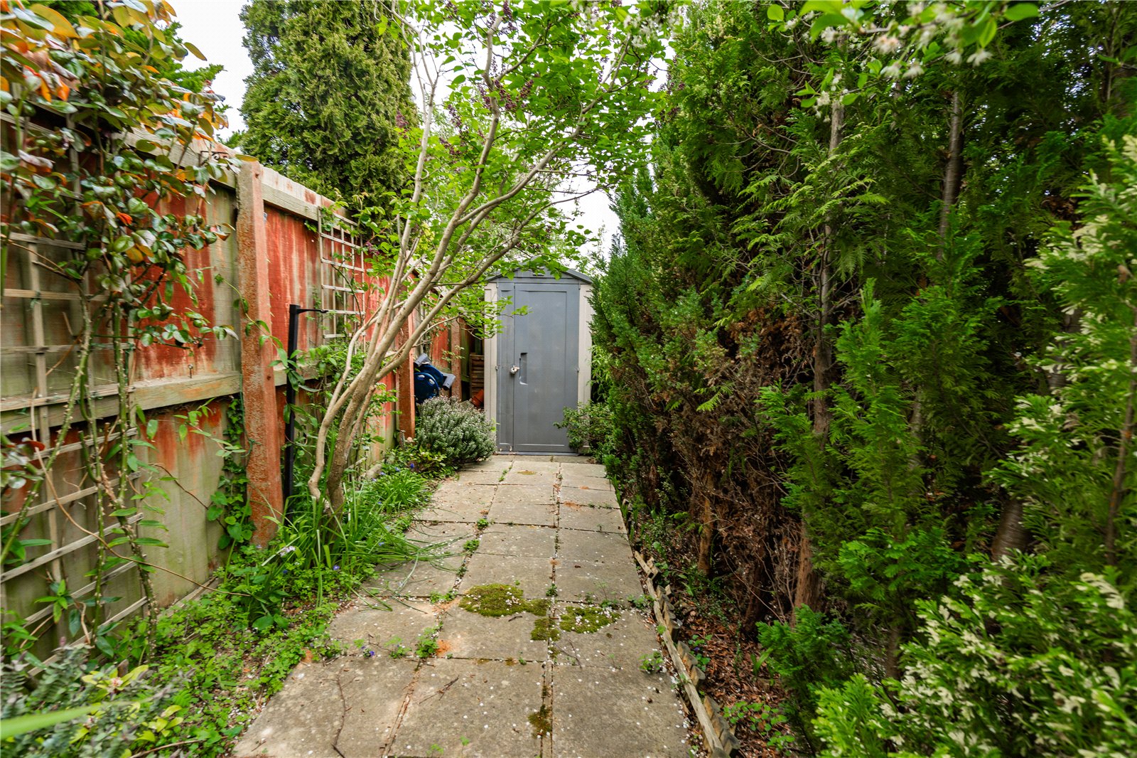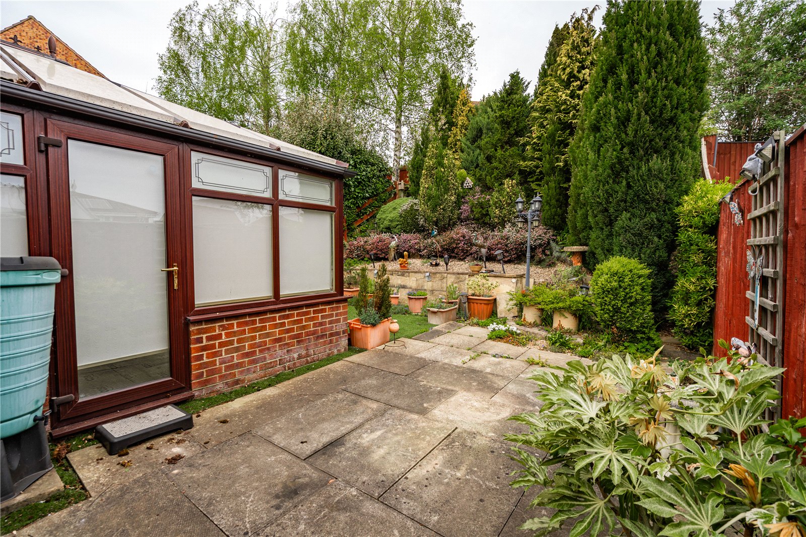 - Stepped rear garden with mature shrubs for privacy