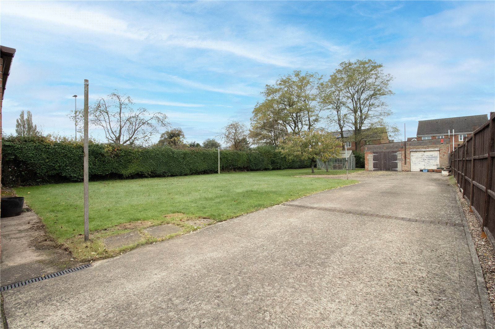 Externally, the home is enclosed by a walled boundary and offers ample off-road parking via a driveway. Side gates provide convenient access to the expansive rear garden, which features a double garage and is predominantly laid to lawn, creating an ideal space for outdoor activities.