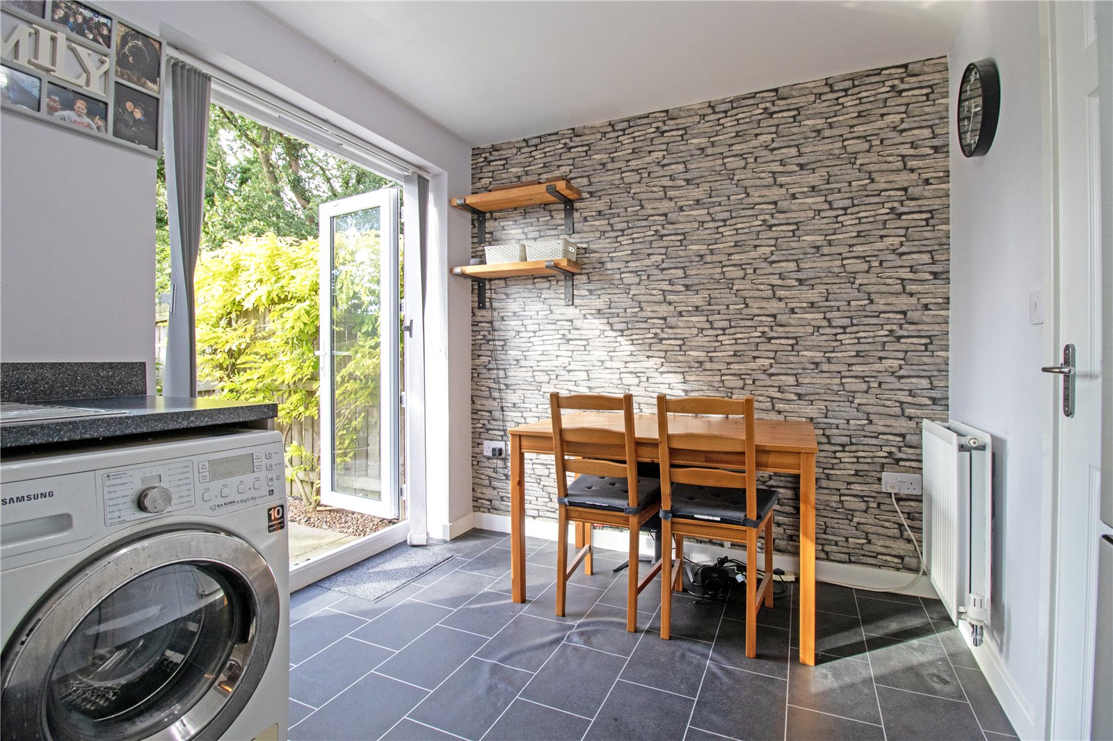 Externally, the property offers off-road parking to the front, with additional pebbled space providing further parking if required. The enclosed rear garden is private and low-maintenance, laid out with paved seating areas, an artificial lawn and a practical storage shed. To the rear, the garden enjoys an open aspect overlooking the rugby pitch, adding to the sense of privacy and space.