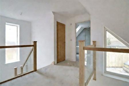 To the first floor, a stunning landing — also finished with a sleek glass balustrade — leads to three well-proportioned bedrooms and a stylish family bathroom, with the principal bedroom benefiting from its own contemporary en-suite shower room. Both the family bathroom and en-suite are finished to a high standard and feature modern wall-mounted sink units, enhancing the clean, contemporary aesthetic. Each bedroom benefits from useful storage within the eaves, maximising practicality while maintaining clean internal lines. The principal bedroom further offers space suitable for the creation of a walk-in wardrobe, providing excellent scope for additional bespoke storage if desired.