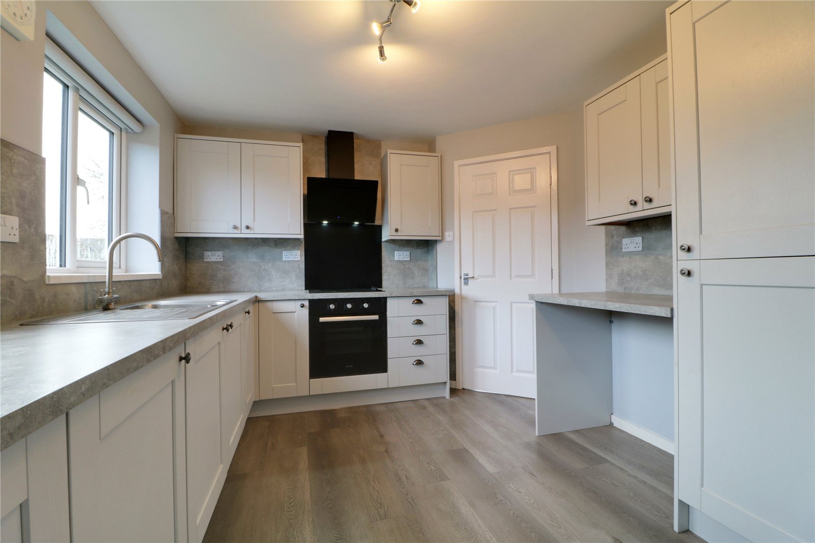 Modern Fitted Dining Kitchen 13'1" x 9'10" (4m x 3m). With further twin rear uPVC double glazed windows. The kitchen includes a range of modern shaker style low level units, drawer units and wall units with brushed aluminium style pull handles and a patterned working top surface with matching uprising incorporating a single stainless steel sink unit with drainer to the side and block mixer tap, a range of integral appliances which includes a fridge freezer, an electric integral oven with 4 ring hob and canopied extractor fan in black, plumbing for a washing machine, continuation of flooring, ceiling spotlights and a dog legged staircase leads to the fiest floor accommodation.