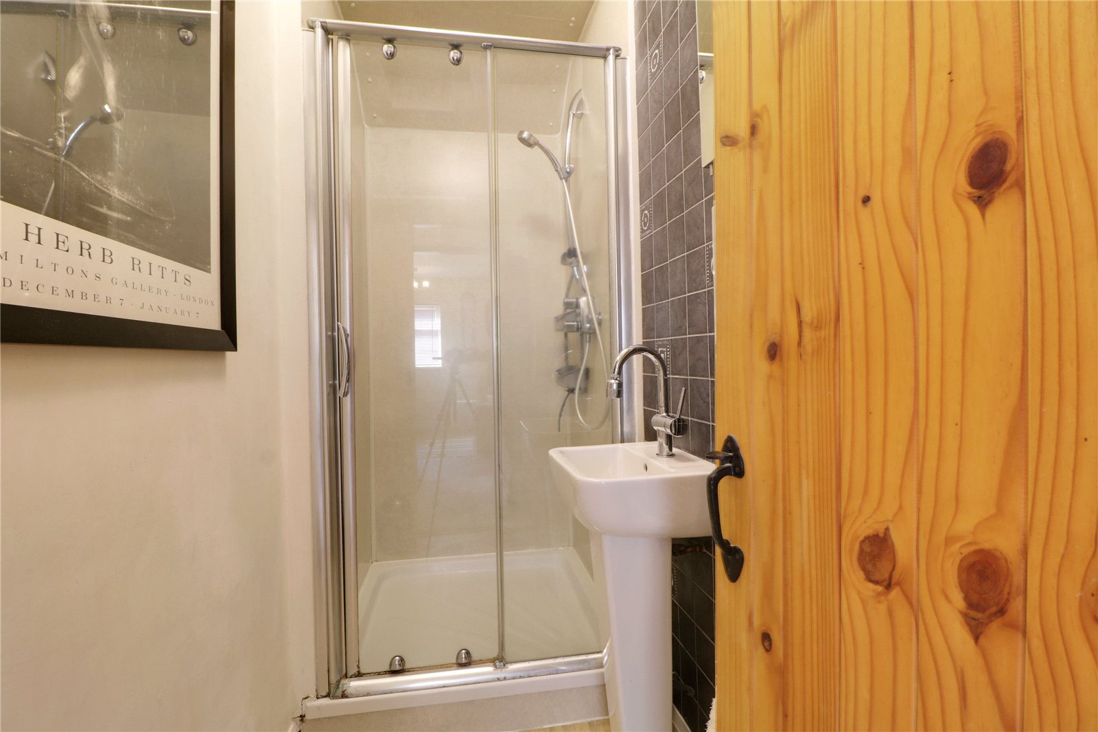 Shower Room 8'3" x 3'5" (2.51m x 1.04m). With a spacious walk-in shower cubicle with sliding door, overhead chrome mains shower with mermaid boarding splash back, a pedestal wash hand basin with central block mixer tap and tiled splash back, wall mounted towel heater, cushioned flooring, central ceiling light and barn style internal doors.
