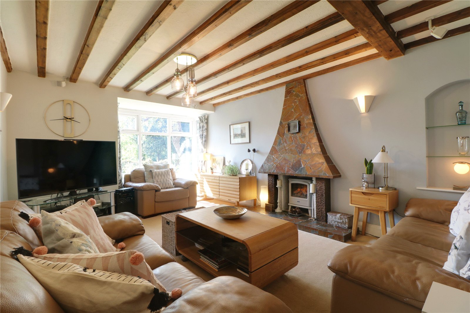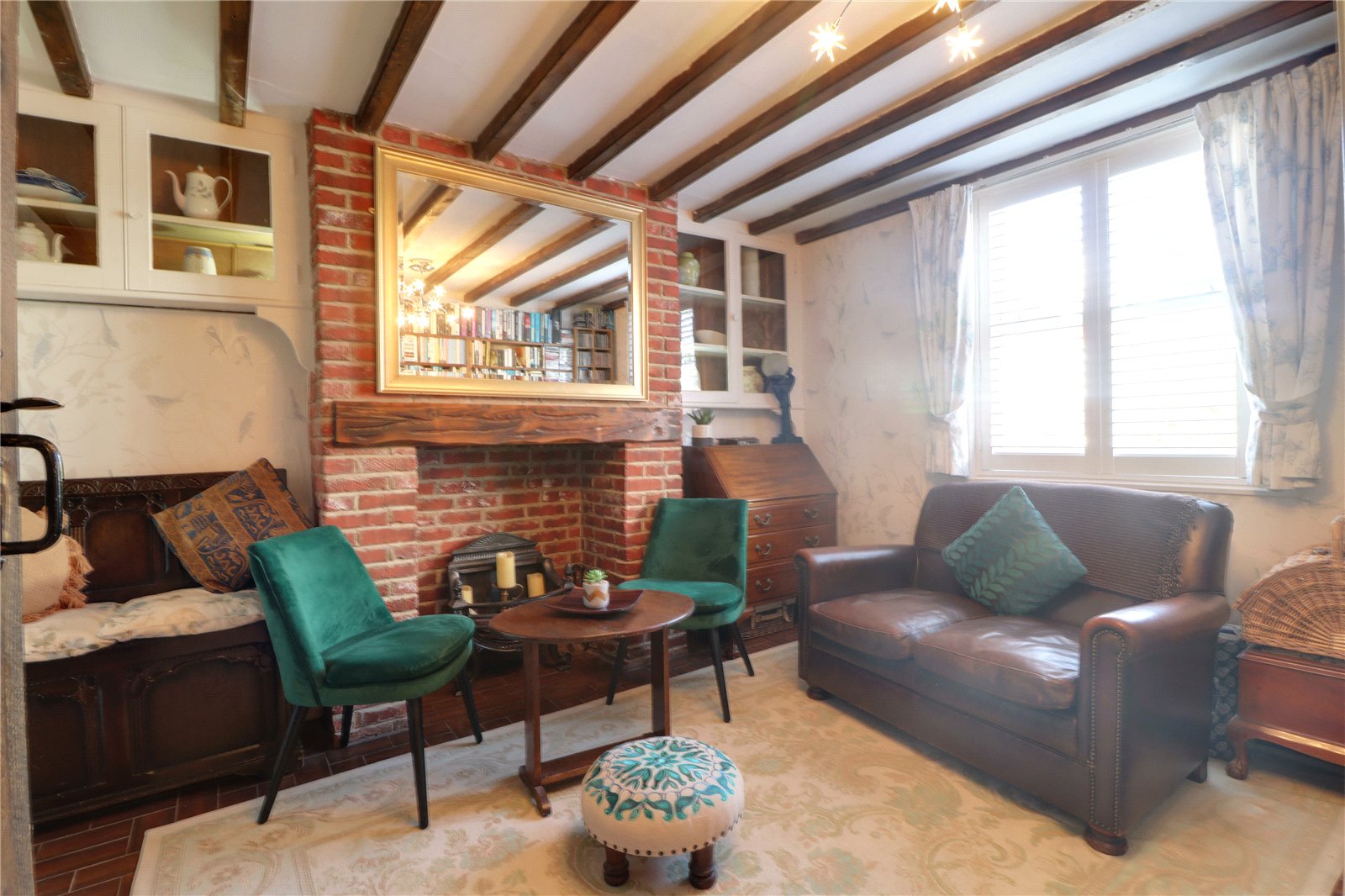 Front Sitting Room 10'2" x 12'4" (3.1m x 3.76m). With a front wood sash sliding glazed window, decorative beams to the ceiling, inset display cupboards and a feature open bricked fireplace with bricked tiled hearth with oak beam and matching tiled flooring.