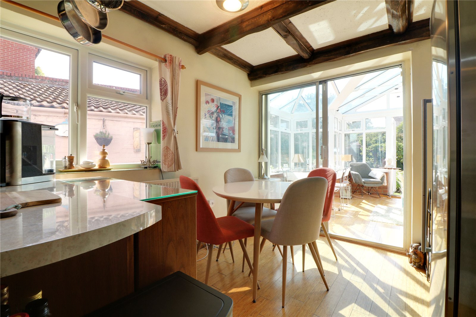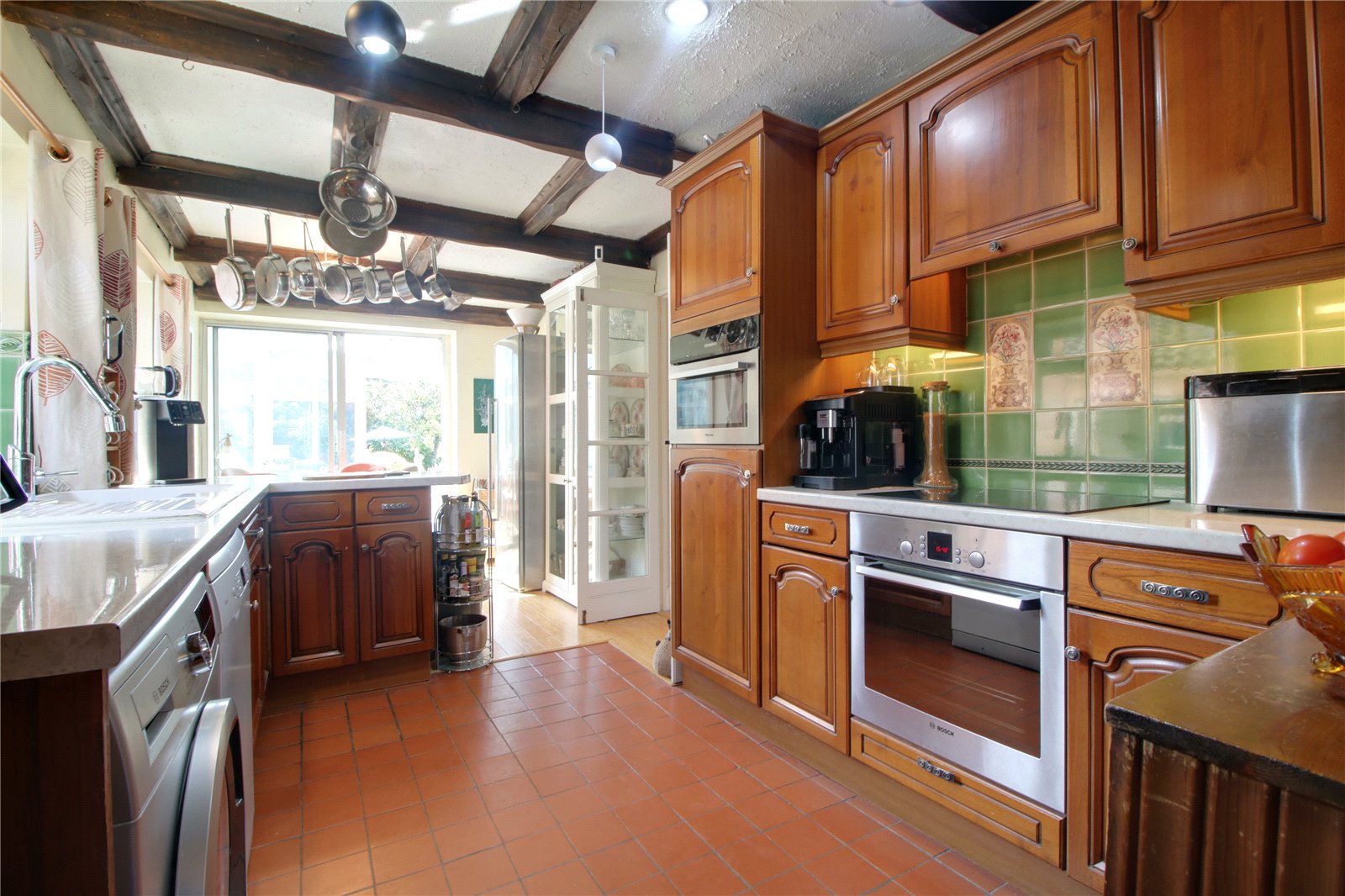 Spacious Kitchen Diner 19'5" x 8'10" (5.92m x 2.7m). With two twin side uPVC double glazed windows with sliding aluminium glazed doors allowing access to the conservatory. The kitchen includes a range of oak fronted low level units, drawer units and wall units with brushed decorative brass aluminium style pull handles with a patterned working top surface, incorporating a range of integral appliances which includes a four ring Bosch electric hob with matching electric Bosch oven, Miele combination cooker microwave grill with overhead integral extractor fan to the hob area with fully tiled splash backs, plumbing for a washing machine and dishwasher, one and a half porcelain sink bowl unit with block mixer tap and drainer to the side, quarry style tiled flooring, further beams to the ceiling, bamboo strip flooring, ceiling spotlights, space for a tall American style fridge freezer and a further internal door allows access to;