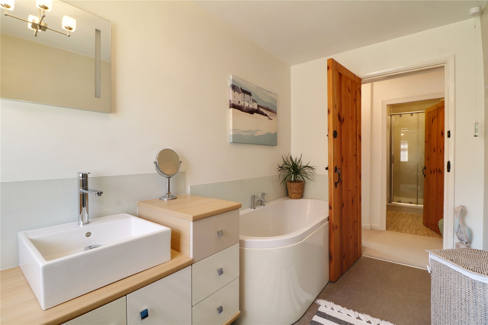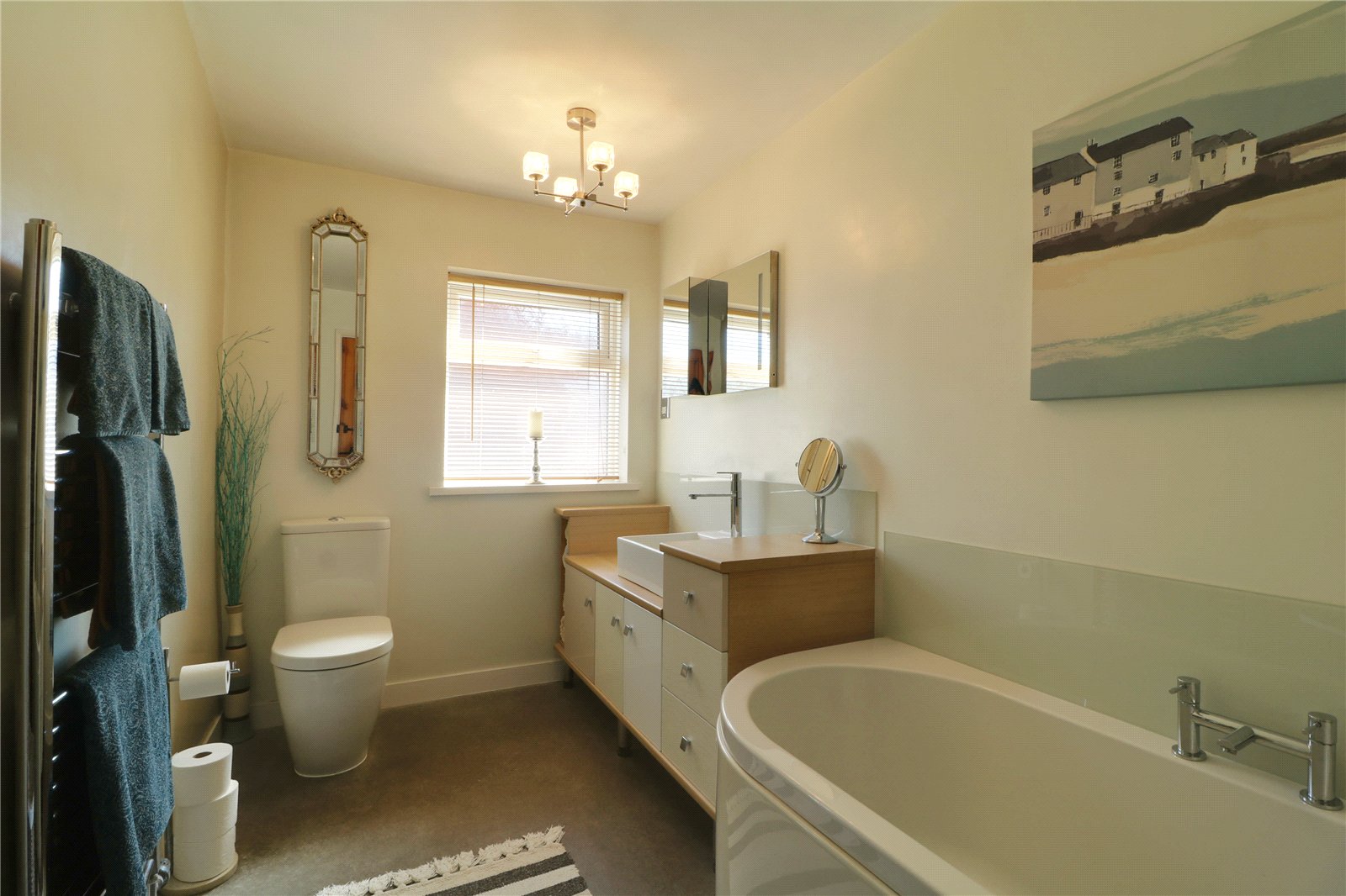 Main Family Bathroom 5'11" x 10'8" (1.8m x 3.25m). With a side uPVC double glazed window with frosted glazing and a three-piece suite comprising double ended panelled bath with central block mixer tap with glass splash back, a low flush WC and a rectangular wash hand basin with storage units and matching drawer units beneath, a wall mounted chrome towel heater and cushioned flooring.