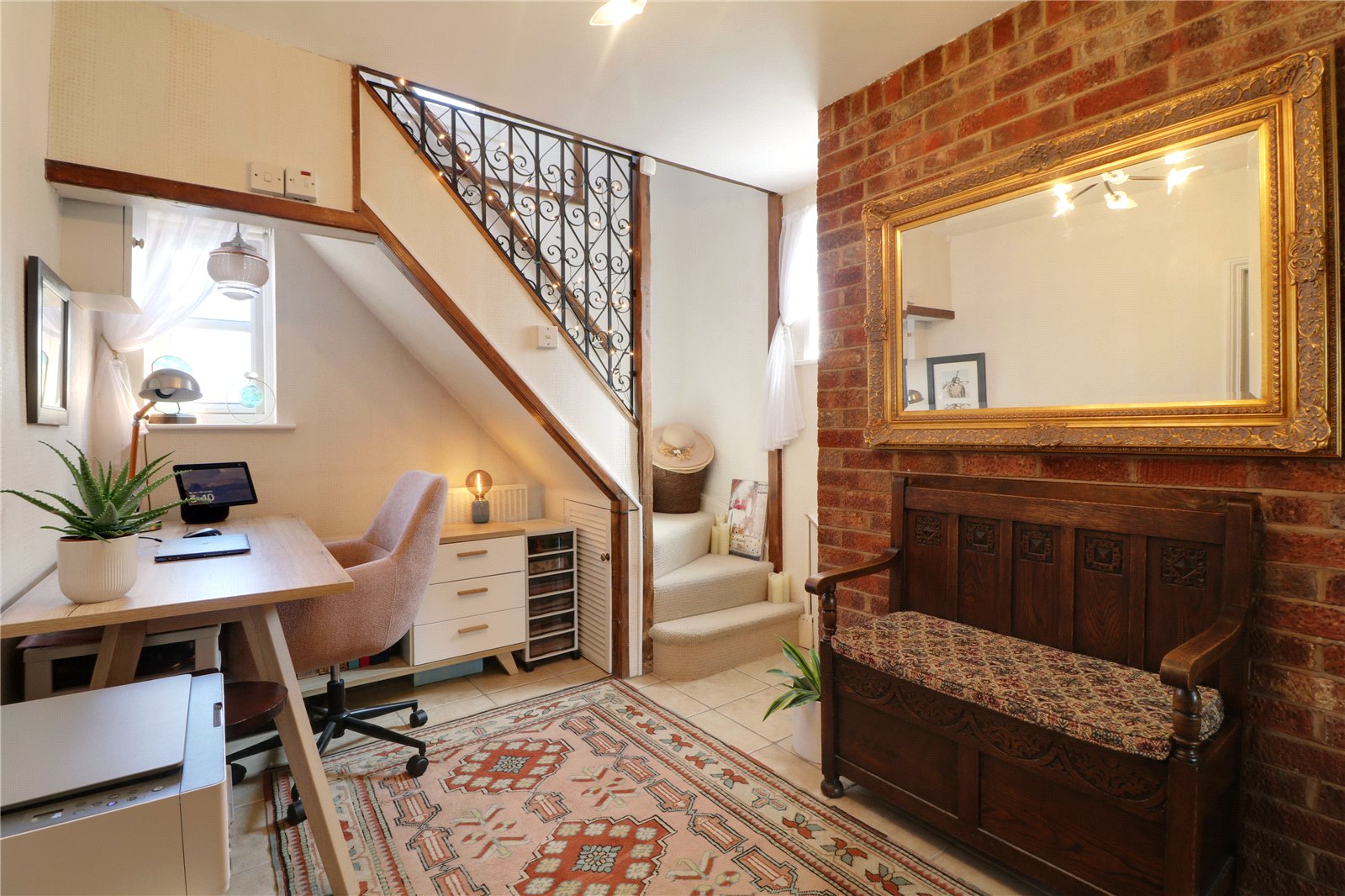 Study/Office 12'2" x 8'10" (3.7m x 2.7m). Including a dual aspect with a side uPVC double glazed window with frosted glazing and a front secondary wood window with frosted glazing, tiled flooring, a built-in storage cupboard, a wall mounted Siemens thermostatic control with further adjoining inset storage and under the stairs storage cupboard, a dog legged traditional staircase leading to the first-floor accommodation with open spell balustrading and adjoining grabrail.