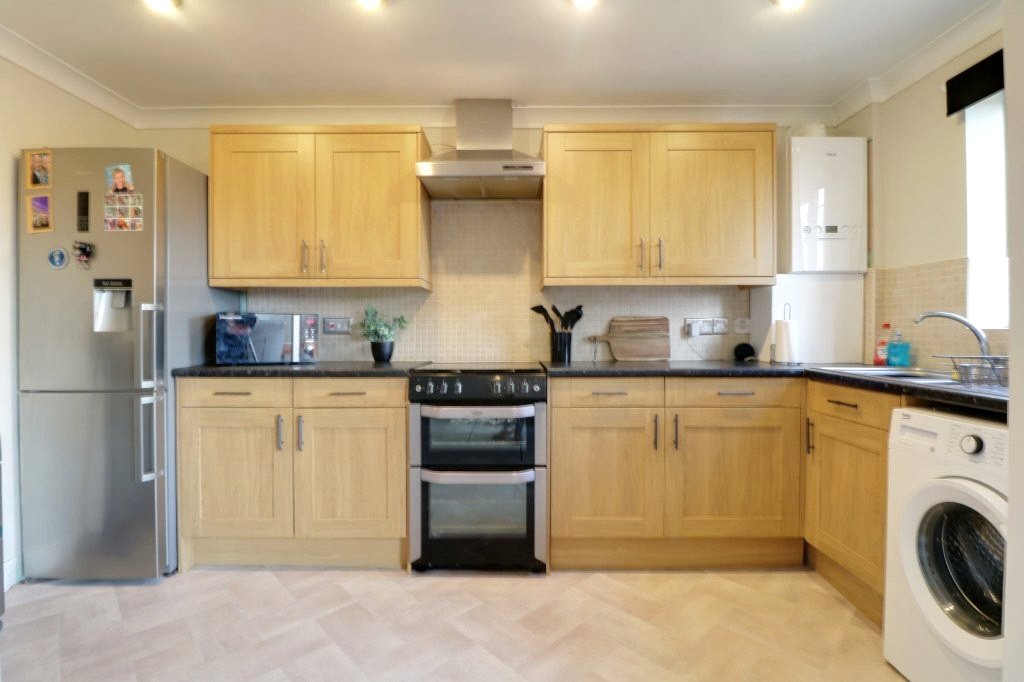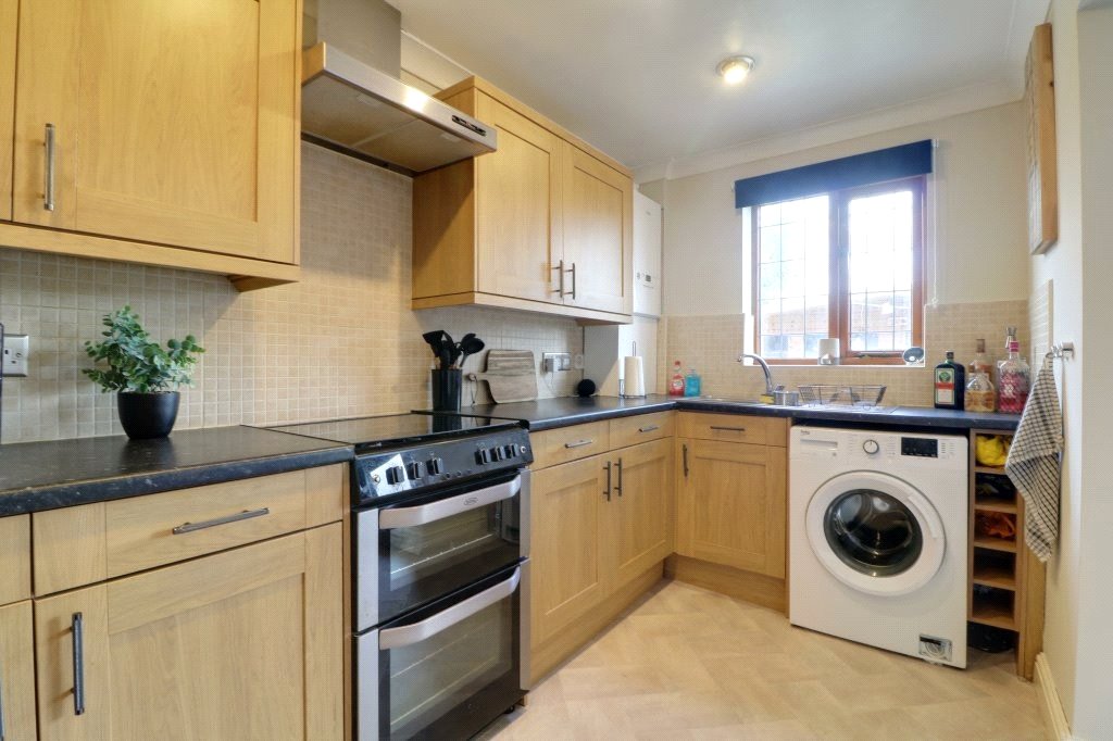 Kitchen 6'7" x 13'1" (2m x 4m). With a rear hardwood double glazed window. The kitchen includes a range of oak shaker style low level units, drawer units and wall units with brushed aluminium style pull handles and a patterned working top surface incorporating a one and a half stainless steel sink unit with block mixer tap and drainer to the side, plumbing for a washing machine, space for a free standing cooker and a tall fridge freezer, vinyl flooring, inset ceiling spotlights, wall to ceiling coving and a wall mounted Ideal Logic gas combi boiler.