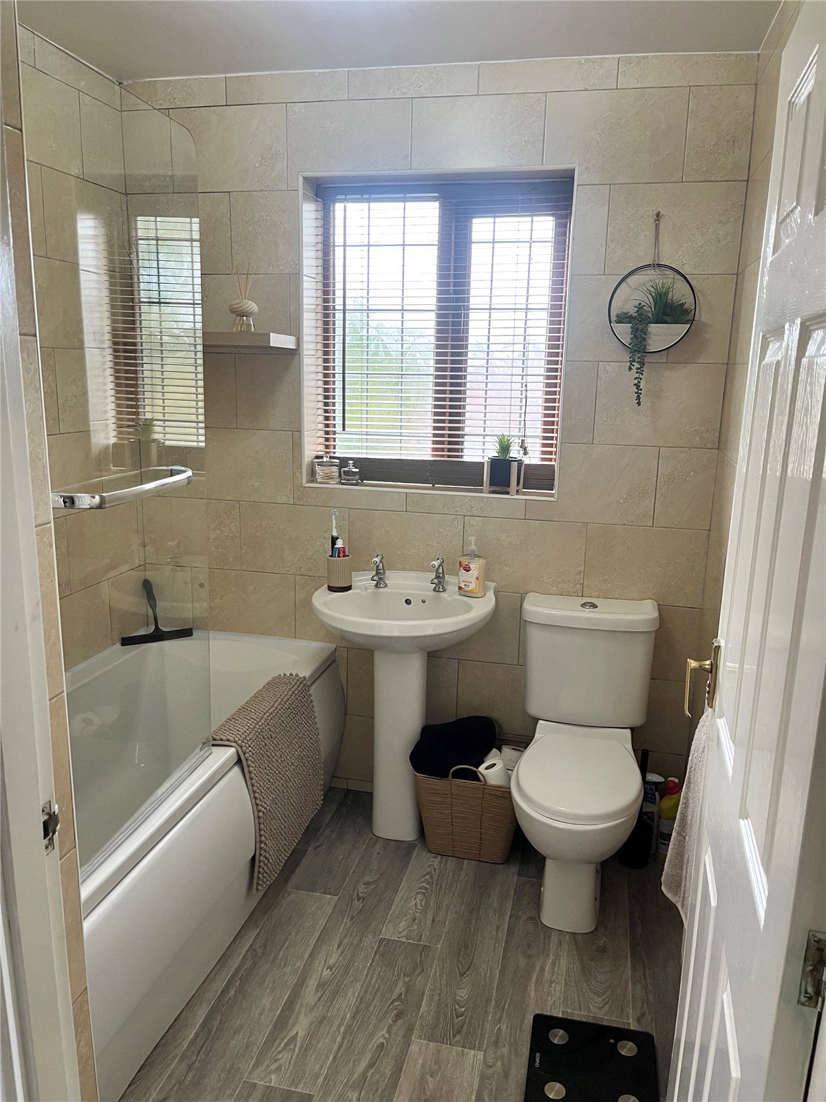 Family Bathroom 5'6" x 6'5" (1.68m x 1.96m). With a rear hardwood glazed window with frosted glazing, a three piece suite in white comprising a panelled bath with overhead shower with folding glazed screen, low flush WC, vinyl flooring, extractor fan and fully tiled walls.