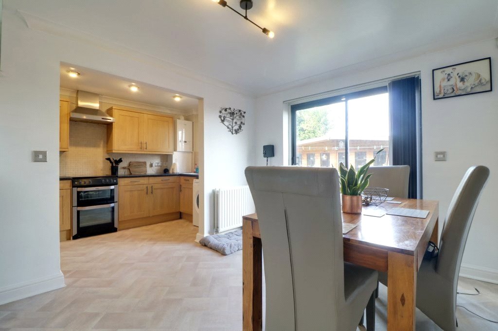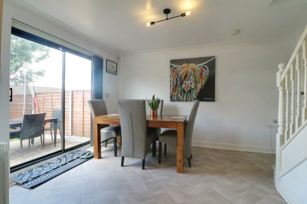 Dining Area 9'10" x 13'1" (3m x 4m). With sliding aluminium glazed doors allowing access to the rear patio, single flight staircase leads to the first floor accommodation with open spell balustrading and under the stairs storage, vinyl flooring, wall to ceiling coving and an opening leading through to;