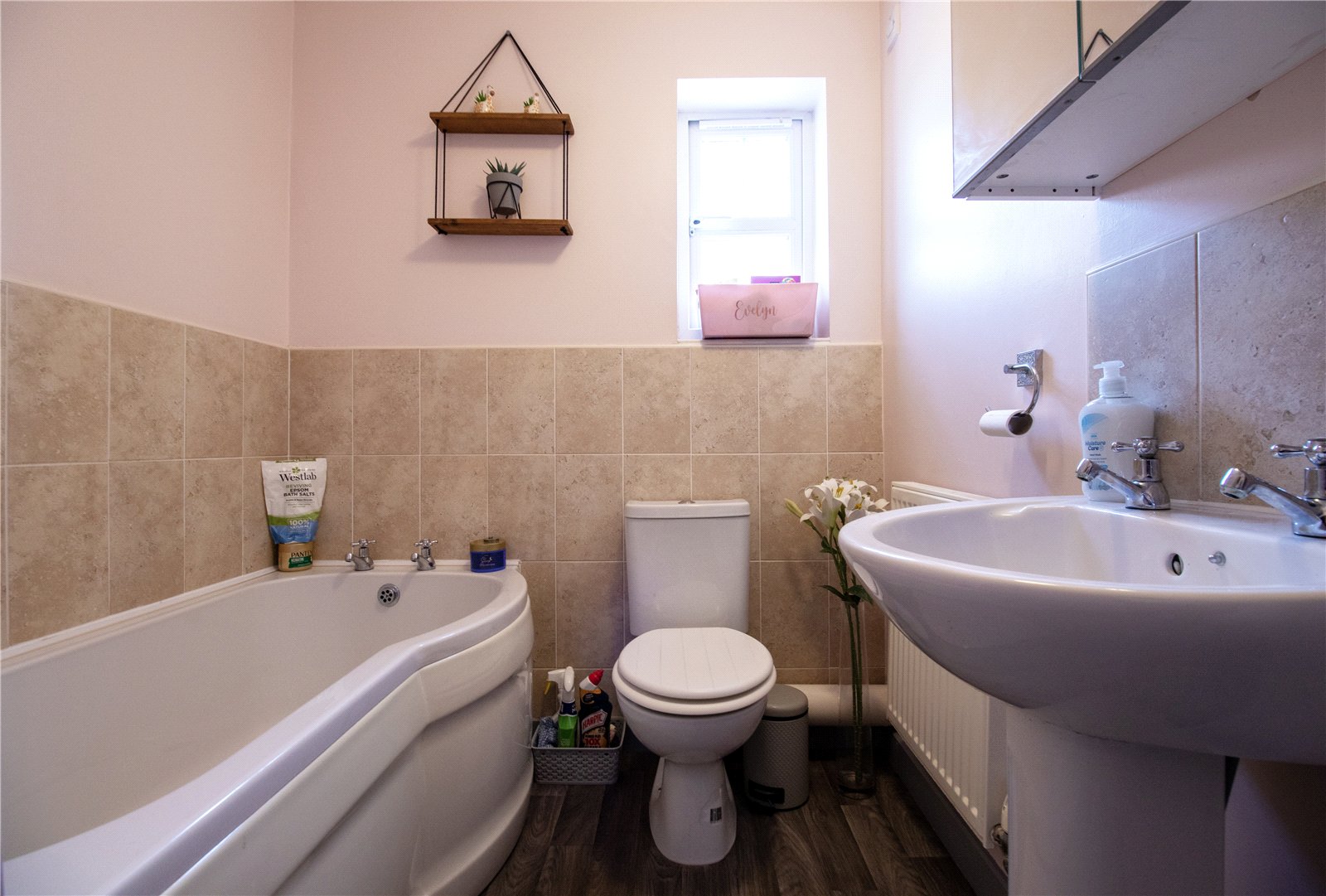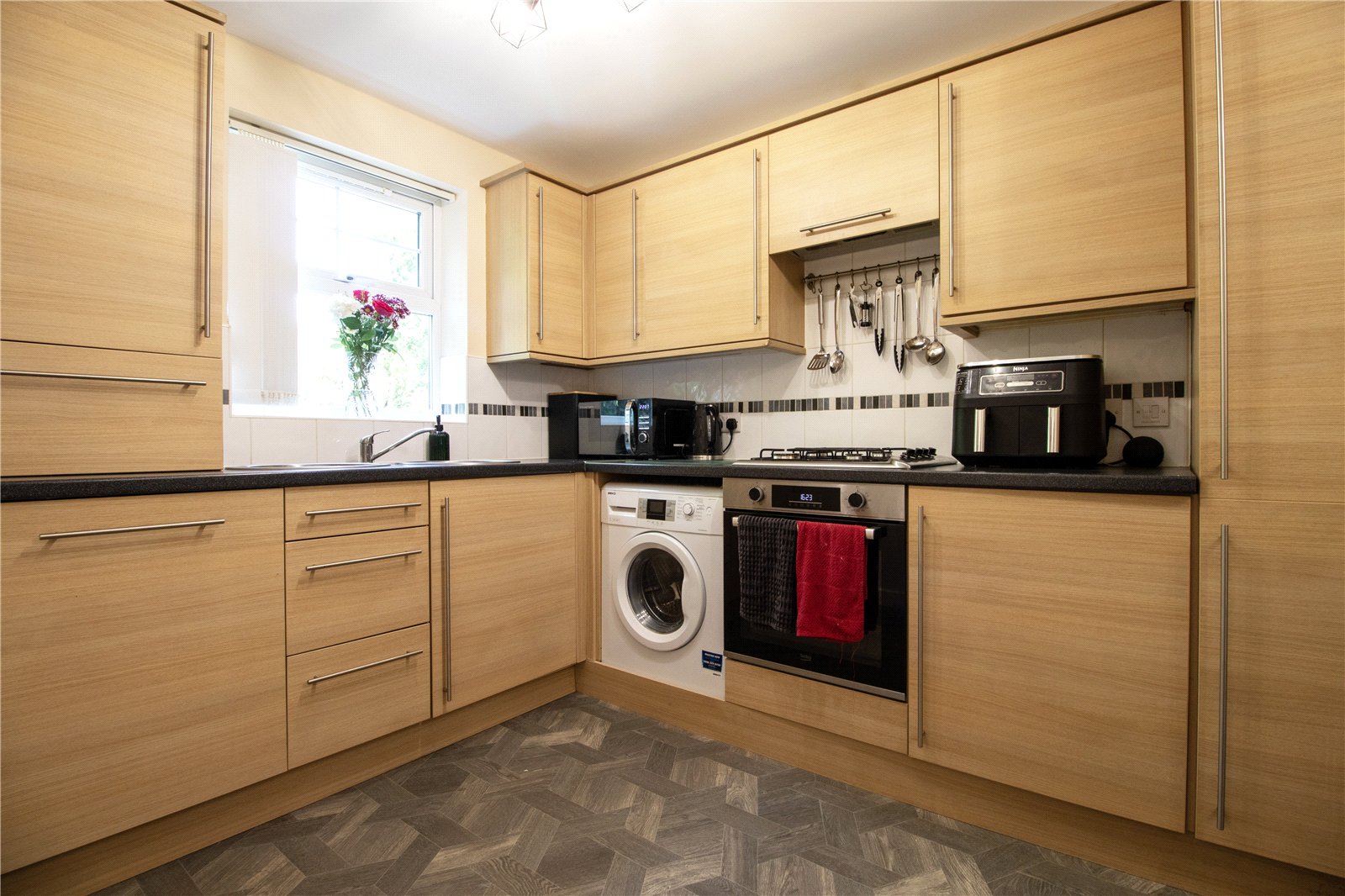 Externally, the home features a south-facing, enclosed rear garden?a suntrap throughout the day?mainly laid to lawn with a paved patio ideal for outdoor entertaining. To the rear, there is an off-road parking space and a garage fitted with an electric door for added convenience.