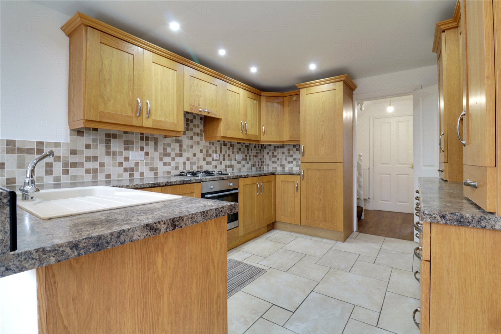 Breakfast Kitchen 15'7" x 10'1" (4.75m x 3.07m). With a rear bow uPVC double glazed window and a side uPVC double glazed door allows access to the garden. The kitchen includes a range of oak shaker style low level units, drawer units and wall units with brushed aluminium style pull handles and a patterned working top surface incorporating a single ceramic bowl units with block mixer tap and drainer to the side, plumbing for a washing machine, space for a tall fridge freezer, built-in Logic electric oven with four ring gas hob with overhead canopied extractor fan with downlighting, tiled flooring, tiled splash backs to the worktops, inset ceiling spotlights, TV input and an internal door allows access back to the dining room.