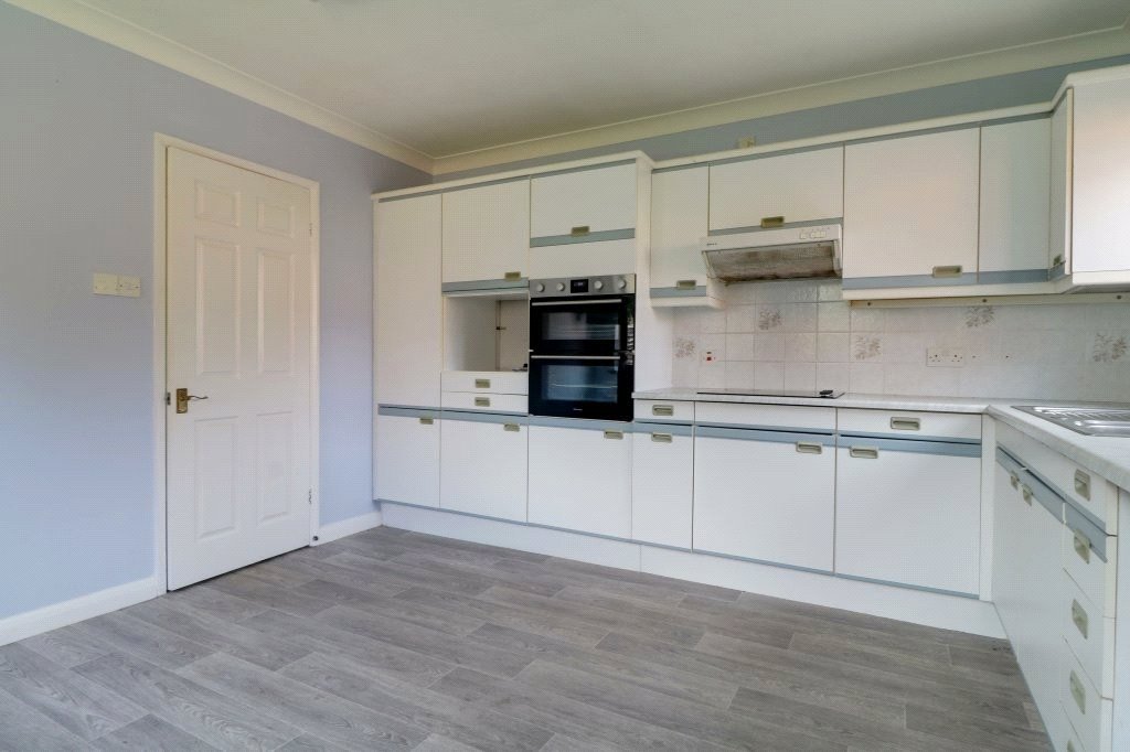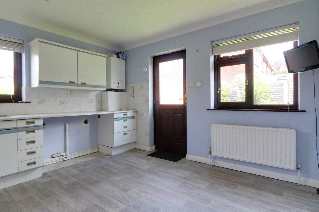 Dining Kitchen 12'4" x 12'5" (3.76m x 3.78m). Enjoying a dual aspect with rear and side wood grain effect uPVC double glazed windows and a matching rear entrance door leads to the garden. The kitchen enjoys a range of white fronted kitchen furniture with a patterned worktop with tiled splash backs and incorporates a one and a half bowl stainless steel sink unit with drainer to the side and block mixer tap, built-in four ring electric hob with eye level double oven, space and plumbing for appliances, tiled effect cushioned flooring, wall mounted Ideal gas fired condensing central heating boiler and wall to ceiling coving.