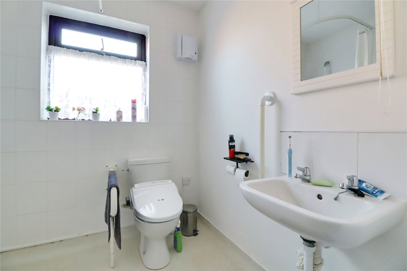Cloakroom With rear uPVC double glazed window with inset patterned glazing, a low flush WC in white, vanity wash hand basin and tiled effect flooring.