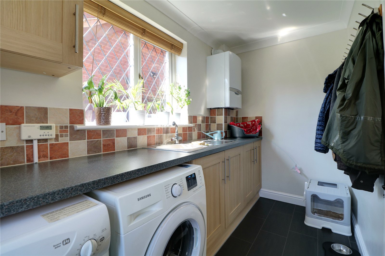 Utility Room 5'3" x 10'1" (1.6m x 3.07m). With a rear uPVC double glazed window, uPVC double glazed entrance door with adjoining window and matching units to the kitchen with a patterned working top with a one and a half stainless steel sink unit with block mixer tap and drainer to the side with tiled splash backs, plumbing for a washing machine, space for a tumble dryer, laminate flooring, extractor fan, a wall mounted Valliant modern gas combi boiler and wall to ceiling coving.